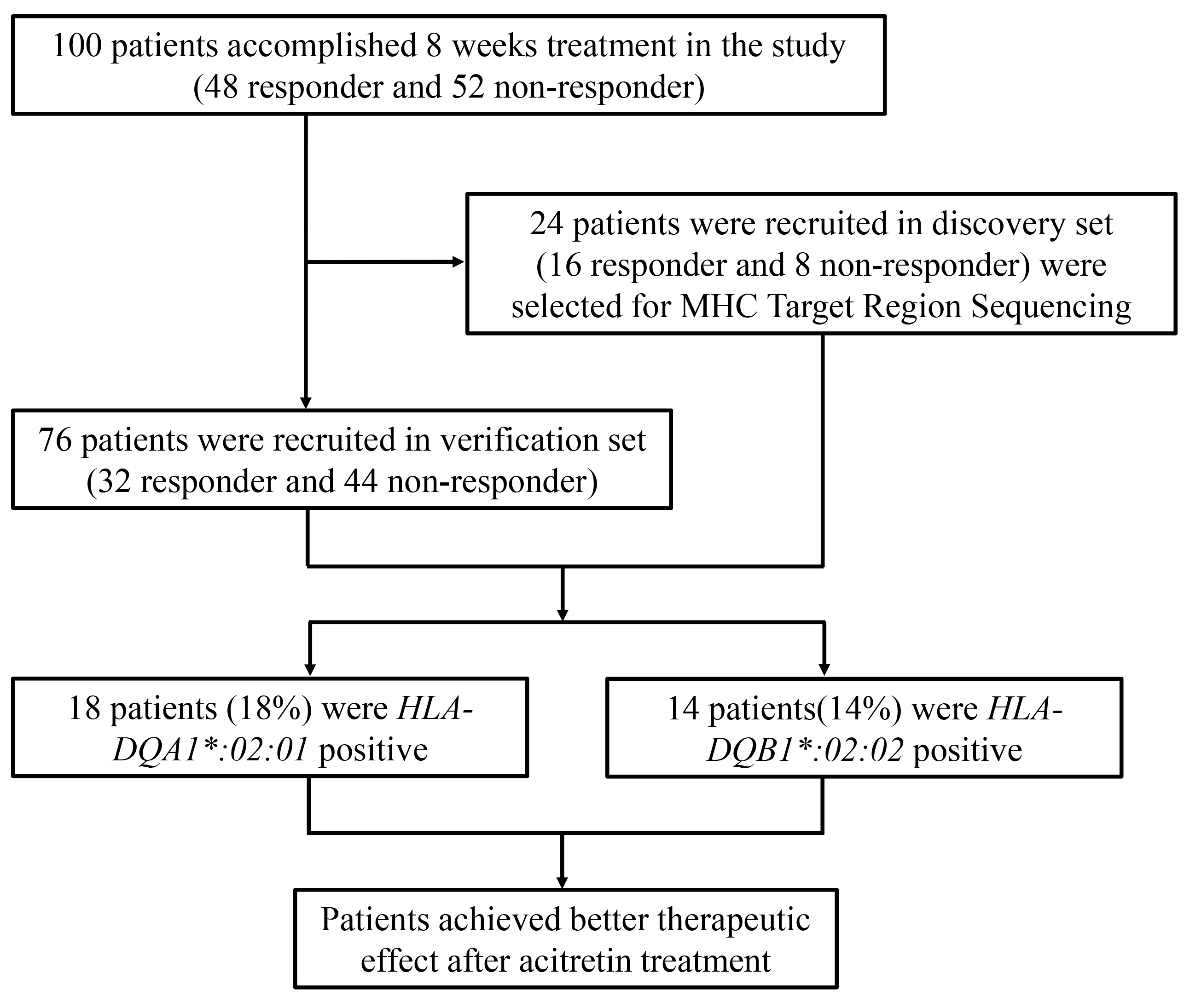 In this study, MiSeq high-throughput sequencing was used to analyze HLA typing in 100 patients with psoriasis who were treated with acitretin for at least 8 weeks. We also sought to identify the relationship between several HLA alleles and acitretin efficacy.