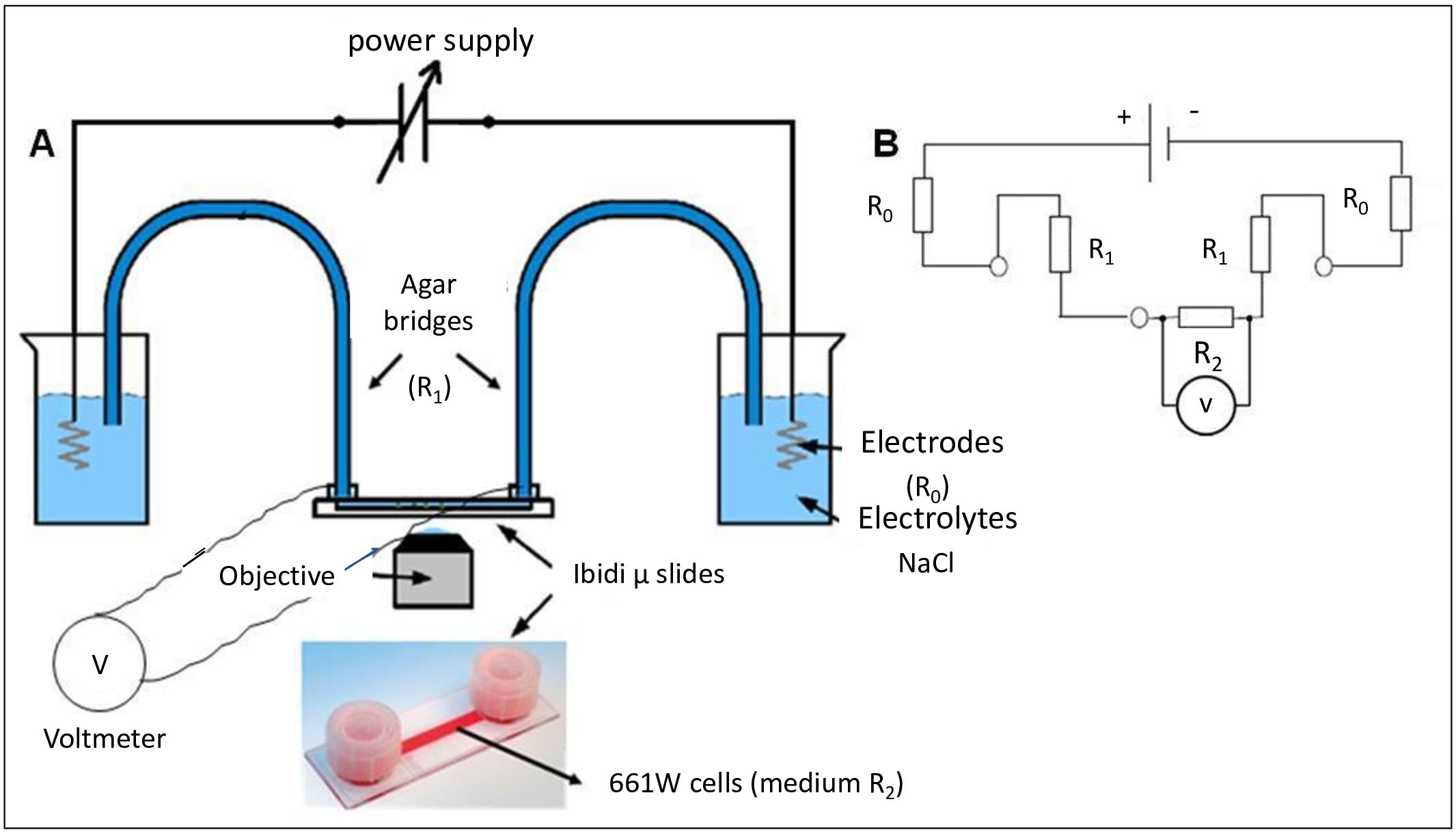 migration assay. (A) Consisting of a power supply, 2 beakers with saline