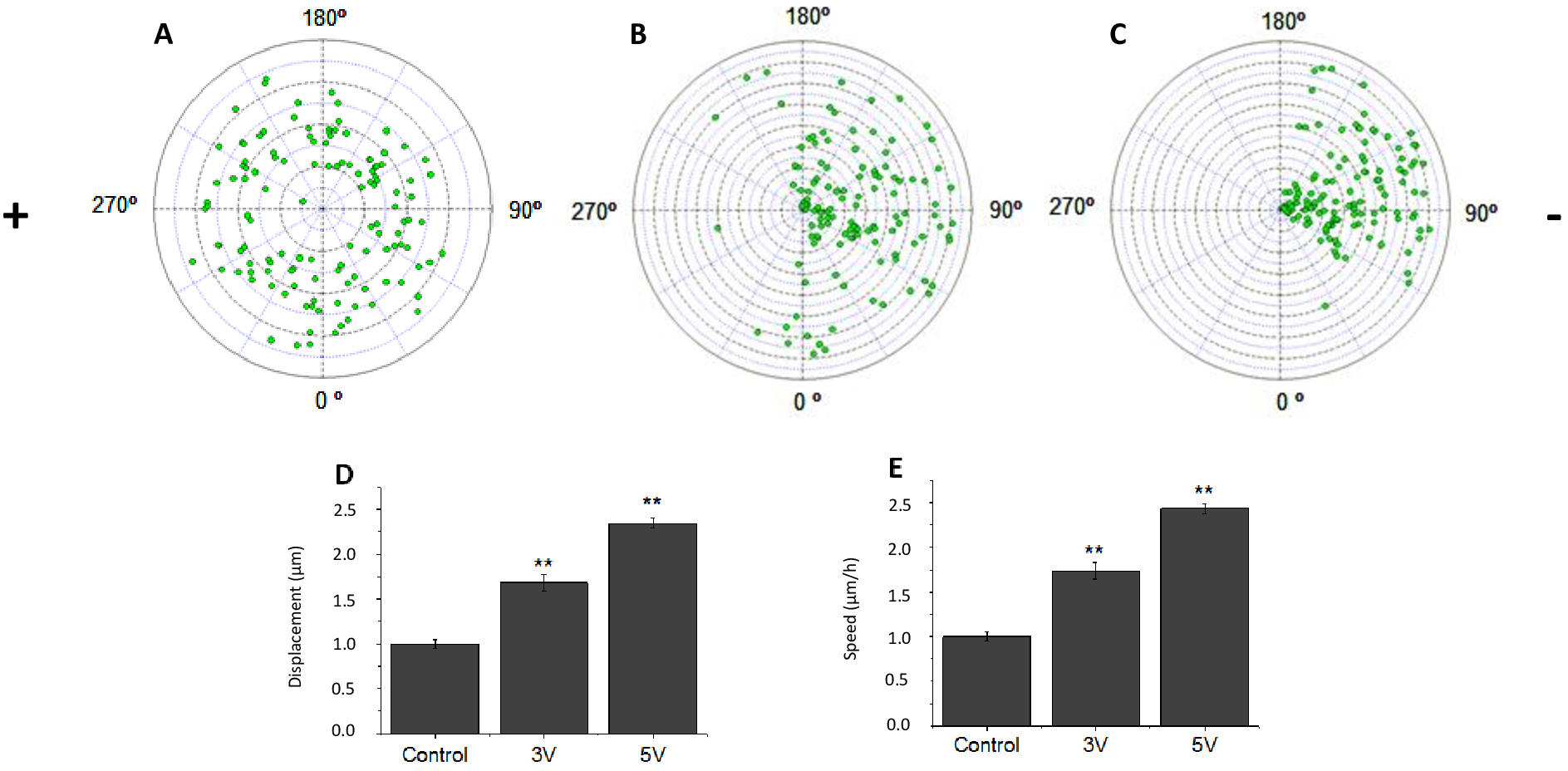 Polar plot shows the cathodal migration of the cells at 3 V/cm EF. (C) Polar plot
