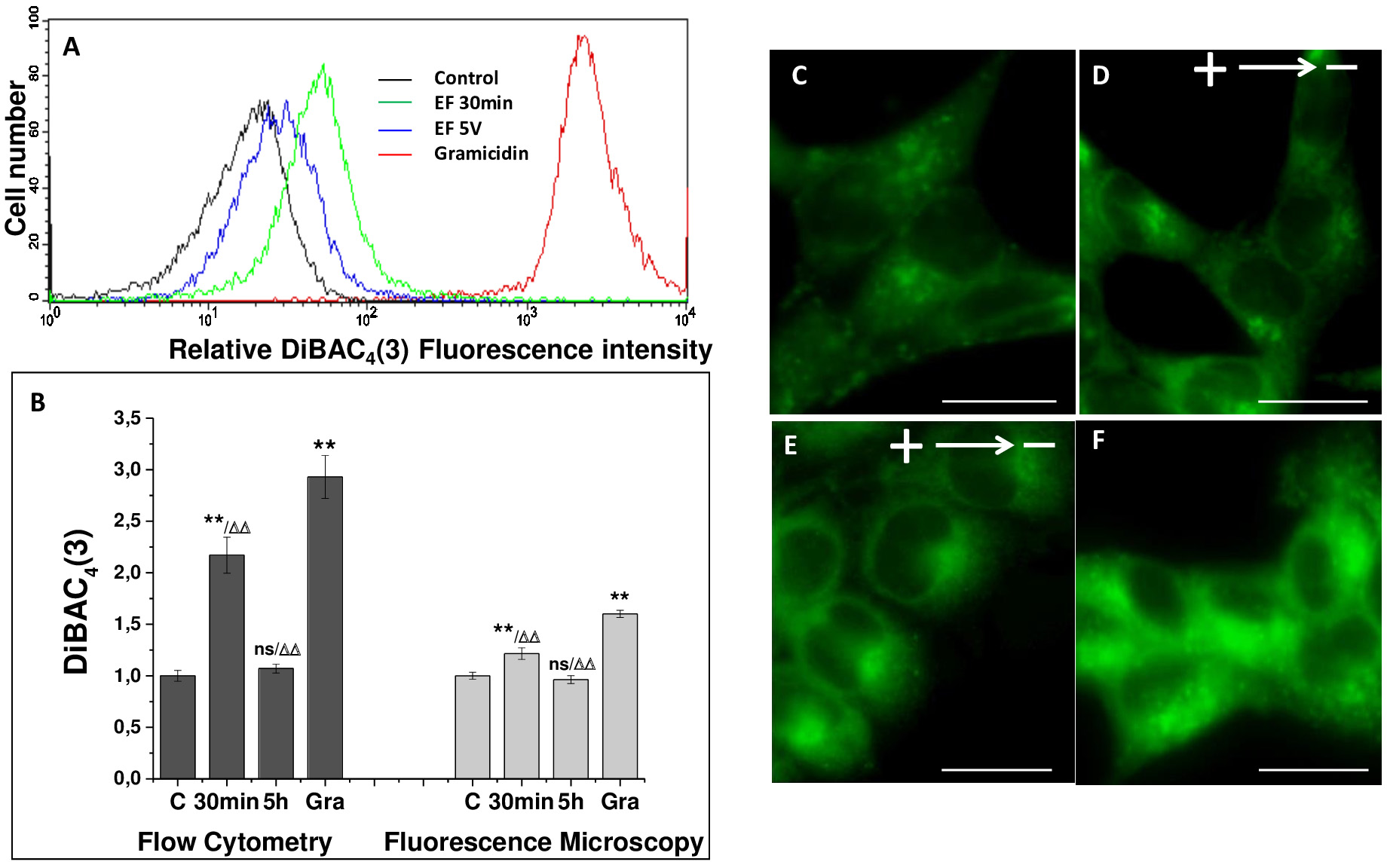 In an EF, perpendicular cell positioning to the field occurs in order to minimize the stress due to the potential changes across the cell plasma membrane due to the constant voltage [46]. The transmembrane potential is affected by various electrical and geometrical properties of the cells such as membrane conductivity, shape and orientation (Fig. 4A–D). In our experiments, depolarization upon EF stimulation was characterized by an increased influx of dye initially which was later stabilized. This transient influx of dye accumulated at the cathodal side of the cells in the presence of EF compared with control cells where the dye accumulation was all over the cell (Fig. 4C–F). This inhomogeneity observed in the plasma membrane potential may be due to an imbalance in ion fluxes through activation of voltage gated ion channels [47]. However, in sum we observed a clear cathodal orientation of the depolarization.