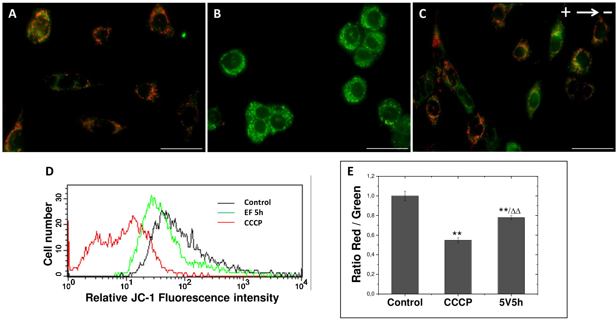 Control cells displayed fluorescence typical of mitochondria, corresponding to high potential. In contrast, positive control cells treated with CCCP presented an only green fluorescence pattern (Fig. 5A–E). In cytometric analysis, cells treated with EF exhibited mitochondrial membrane potential loss with 20% decreased fluorescence ratio in relation to control. There is an increased mitochondrial localization in the EF treated cells at the anodal side compared to the control cells where the distribution of mitochondria is random. In addition, the mitochondrial membrane potential is slightly higher (more red than green fluorescence) at the anodal side of the cell; also, the number of mitochondria is higher on this side. Furthermore, we analyzed the changes in mitochondrial calcium in the presence and absence of EF by transfecting the cells with mito-GcaMP2. We observed in the cells treated with EF an increased amount of mitochondrial calcium towards anodal side of the cells compared to control (Supplementary Fig. 2).