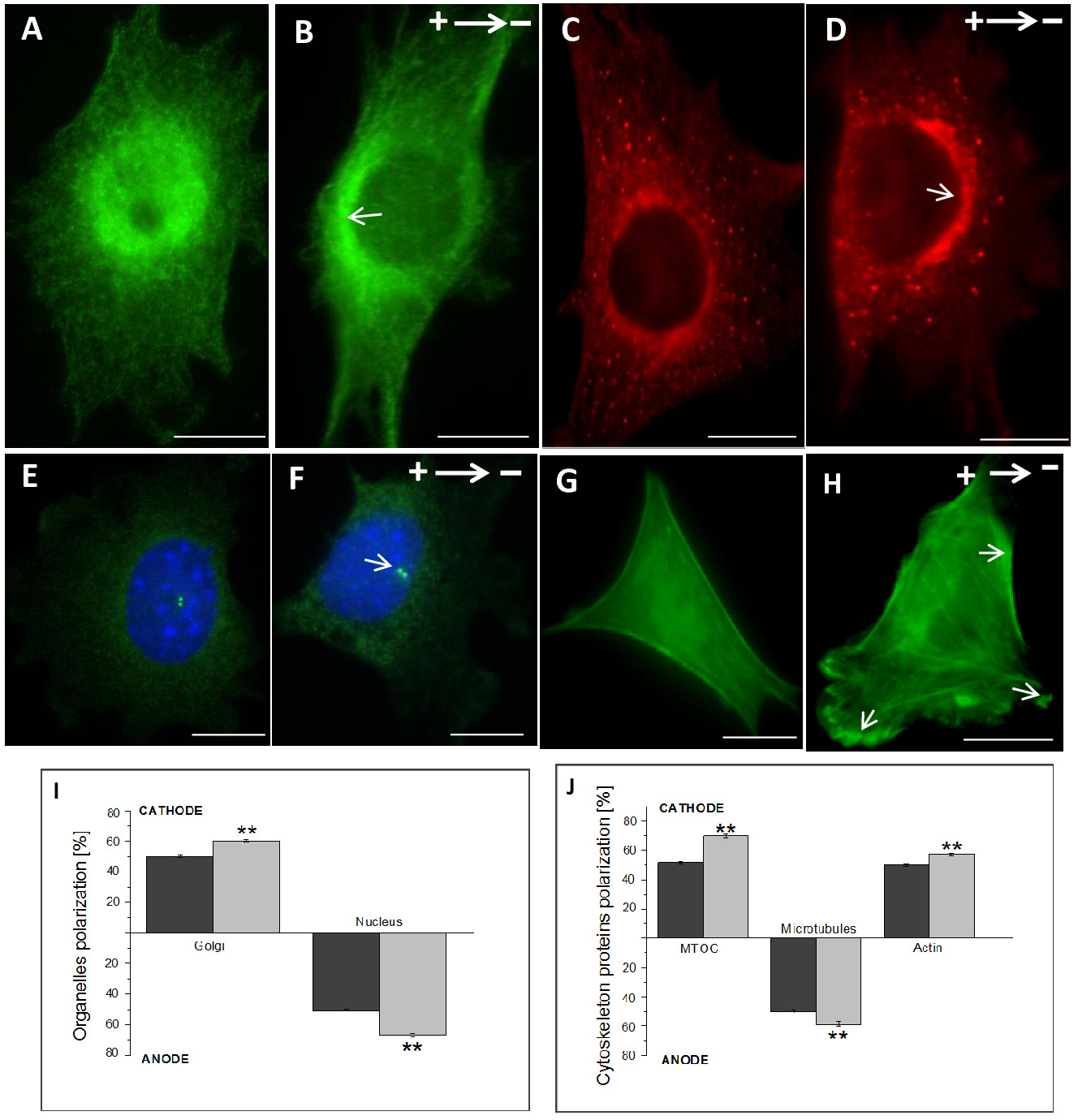 redistribution of microtubules, Golgi, MTOC and actin towards cathode or anode