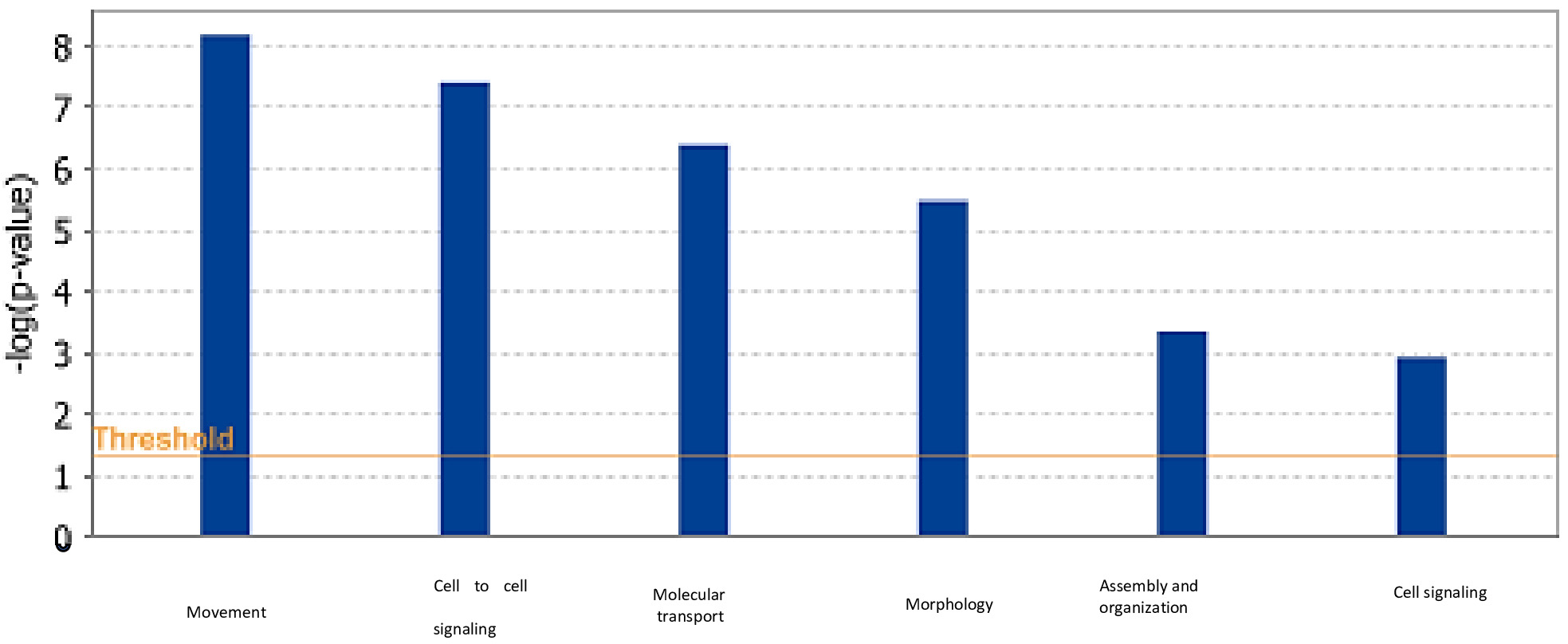 To understand the association of EF stimulation on cells, mRNA sequencing was performed. Our analysis shows that differential expression of genes due to EF govern several important molecular and cellular function. Of several functions, the major events altered were cellular movement, cell to cell signaling, molecular transport, morphology, assembly and organization, and cell signaling (Fig. 7). The respective genes involved in the functional networks are listed in Supplementary Table 1. Further studies are being carried out to study the effects of EF on different pathways in this cell line.
