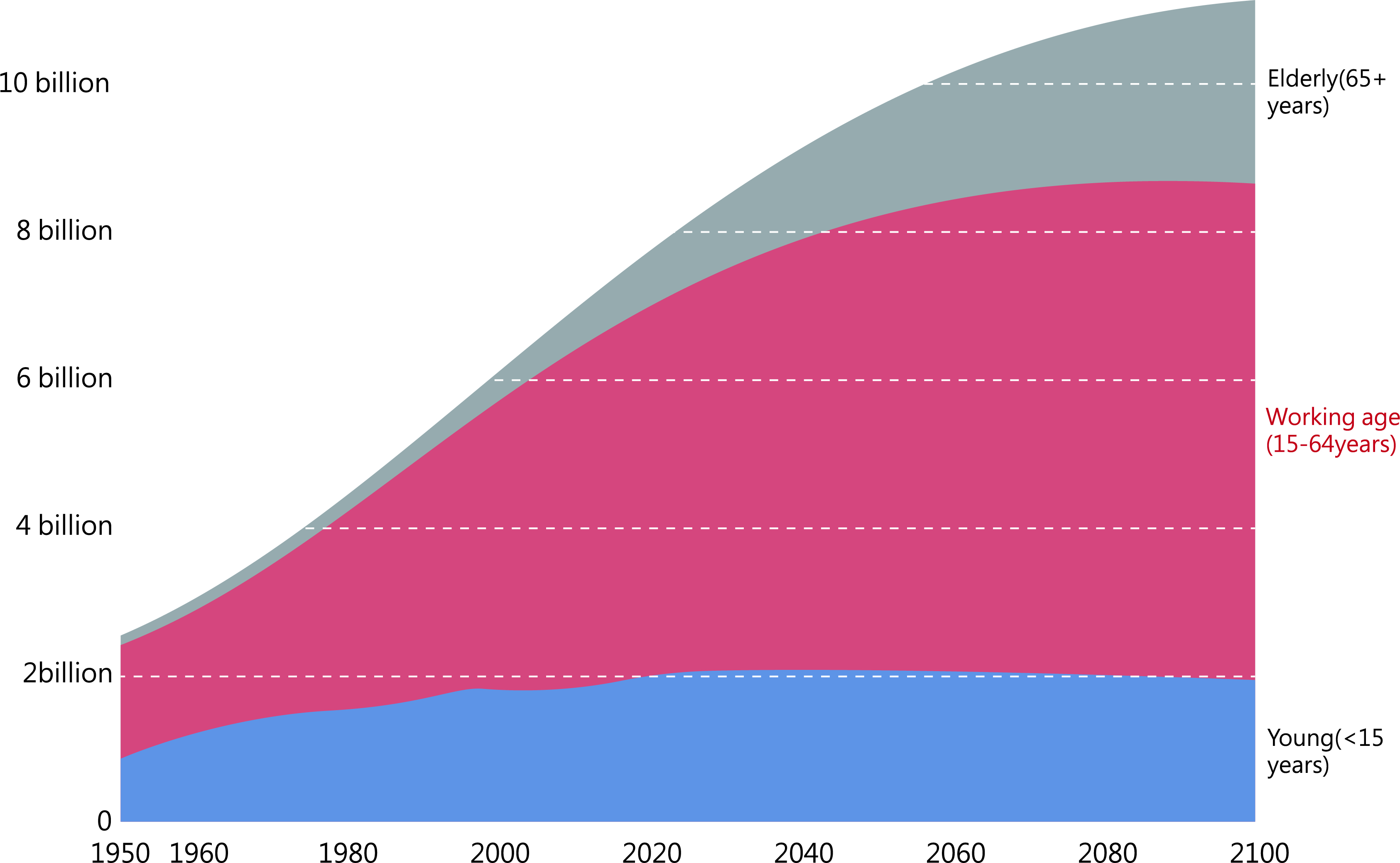 Population size of young, middle-aged, and older people, 1950–2100. Historical estimates for 1950–2015 and estimates based on United Nations (UN) medium-term scenario projections to 2100. Source: United Nations Century Population Prospects (2017).