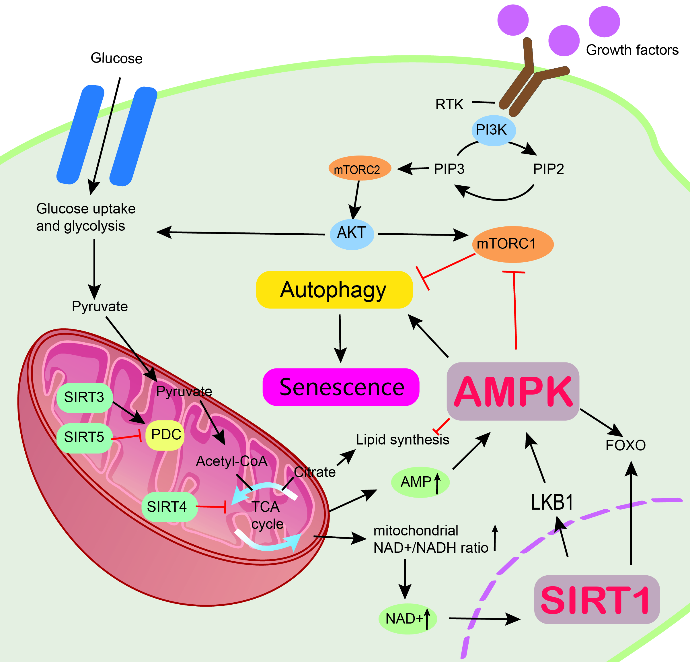 Mechanism by which AMPK and sirtuin proteins regulate metabolism and resist aging. Multiple signaling pathways are involved in metabolic control, including the PI3K/AKT pathway, mTOR, AMPK, and sirtuins. Regulation of cellular senescence through the SIRT1/LKB1/AMPK pathway. AMPK, AMP-activated protein kinase; PI3K/AKT, Phosphatidylinositol 3-kinase/protein kinase B; mTOR, The Mammalian Target of Rapamycin; SIRT1, sirtuin 1; SIRT3, sirtuin 3; SIRT4, sirtuin 4; SIRT5, sirtuin 5; LKB1, liver kinase B1; FOXO, Forkhead box class O; mTORC2, mTOR complex 2; RTK, receptor tyrosine kinase; PIP2, phosphatidylinositol 4,5-bisphosphate; PIP3, phosphatidylinositol 3,4,5-trisphosphate.