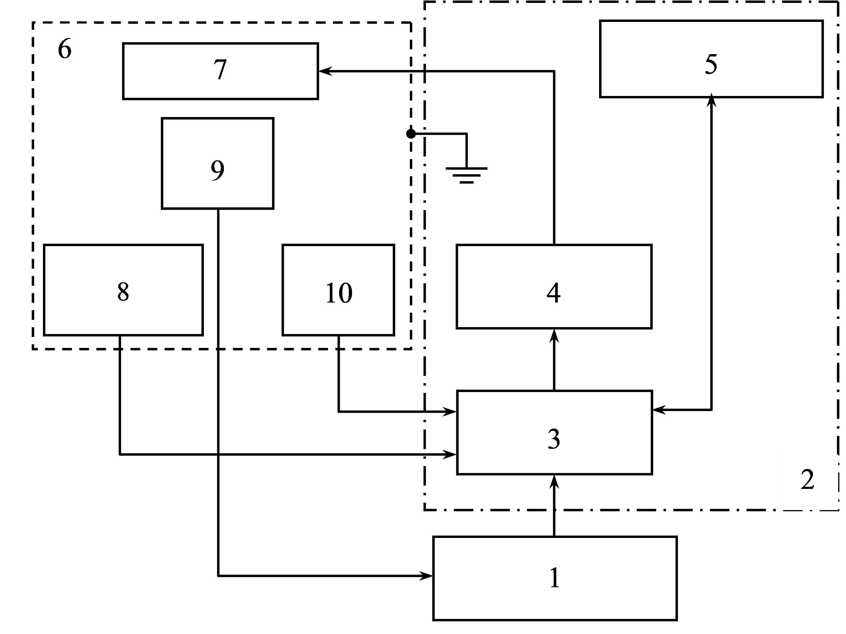 Fig. 1.Structural diagram of a device for automated search for optimal parameters for processing biological fluids in an alternating magnetic field. 1: personal computer; 2: generator unit; 3: microcontroller; 4: power amplifier; 5: control and indication unit; 6: grounded shielded chamber; 7: emitter; 8: electromagnetic field strength sensor; 9: measuring module with a sample; 10: temperature sensor.