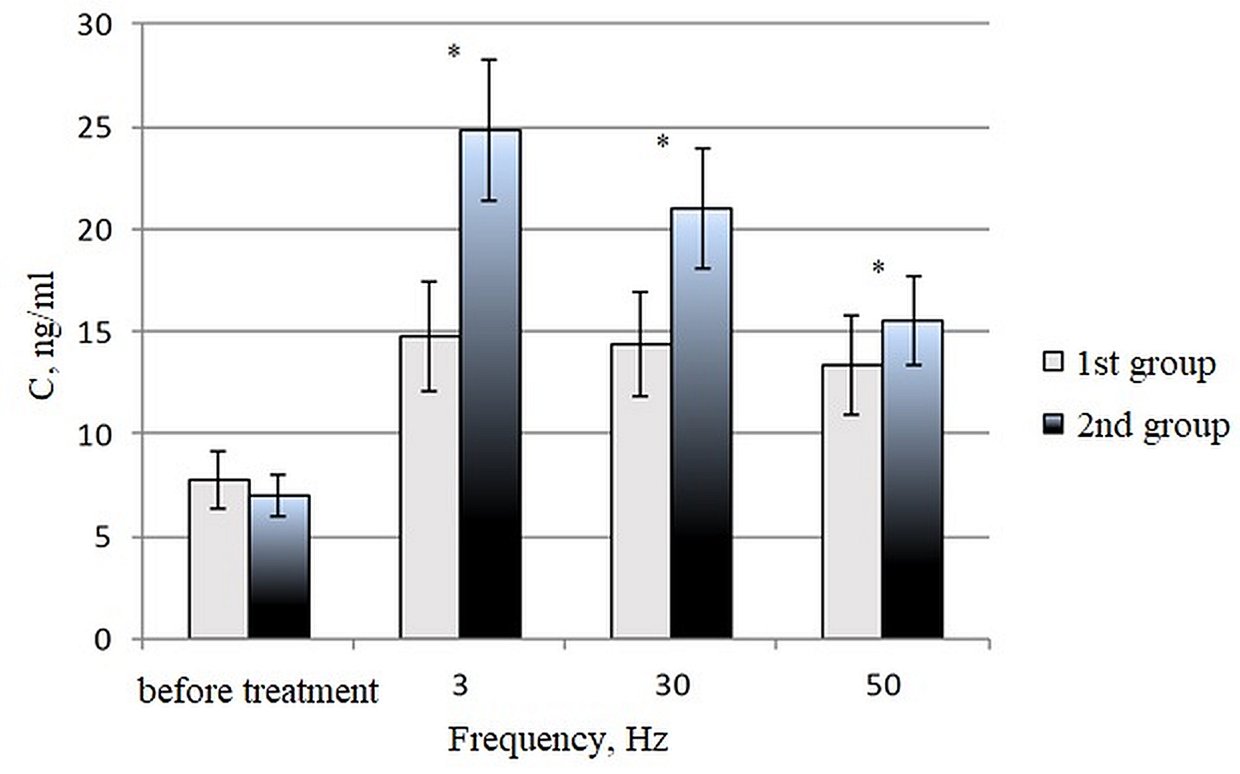 The impact of MFs on living systems, especially those in the low-frequency and extremely low-frequency ranges, can be two-fold in nature. On the one hand, the negative effect of magnetic fields is associated with the need to protect the human body since its effect on living systems can lead to DNA damage: it can initiate oxidative modification of nitrogenous bases and increase the number of single- and double-strand breaks [22, 27, 28]. On the other hand, in recent decades, extremely low-frequency MFs have occupied a special place in medical research, especially in the field of cancer treatment and in combination with chemotherapeutic drugs and pain relief [29, 30]. It is assumed that the rate of diffusion through biological membranes, the orientation and conformation of biological macromolecules, and the concentration of free radicals can all change under the action of MFs [22, 31, 32]. In neurophysiology, transcranial magnetic stimulation (TMS)—technology that stimulates the brain and cortical neurons using alternating magnetic fields—is increasingly being used [33]. Studies, where TMS therapy is combined with genetics, have clearly indicated that the genome is the main factor that controls the effects of TMS (neuronal susceptibility and exposure strength) [34, 35]. In addition, in recent studies, the presence of natural oscillation frequencies in genes was established, depending on the nucleotide sequence, which may be the reason for the presence of individual frequencies that cause biological effects [36]. In our opinion, one of the objectives of research being conducted in this area should be to study the effect of gene polymorphisms and their sensitivity to low-intensity, variable MFs, which are used in medical practices.