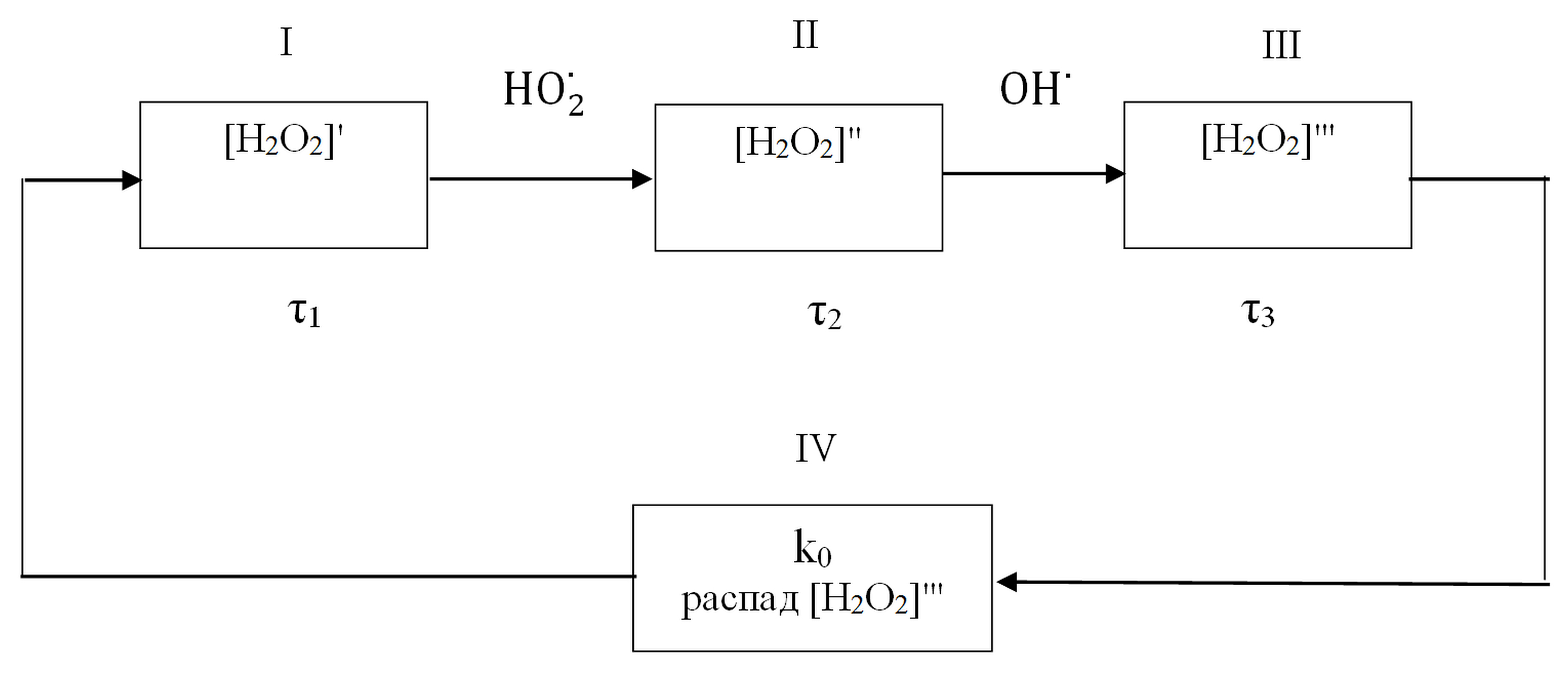 In dilute solutions of biopolymers, the processes of ROS formation proceed as a chemical oscillator [42]. To describe the chemical oscillator in the conversion of hydrogen peroxide, the longest-lived ROS in an aqueous solution, we used chemical equations with known simplifications.