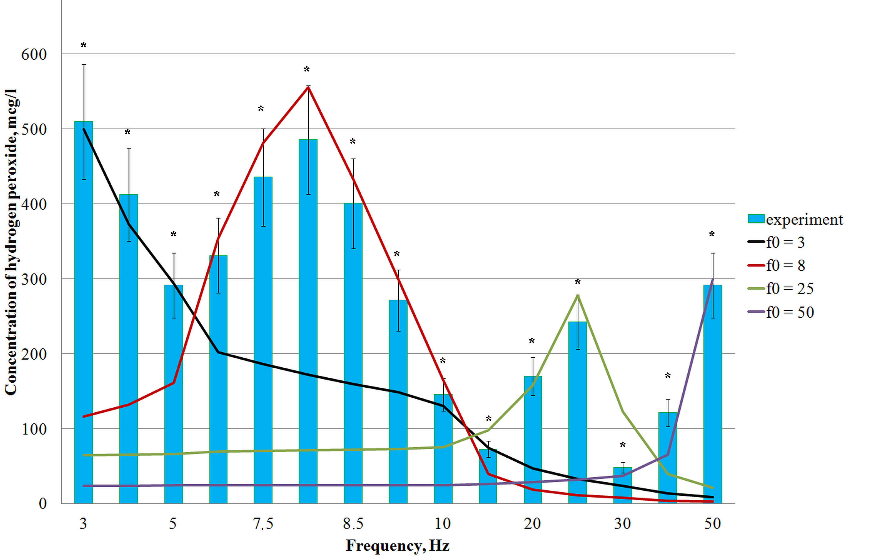 Theoretical dependences for the content of hydrogen peroxide in an aqueous solution of DNA relying on the frequency of an alternating magnetic field have been constructed. The calculation considered the strength of the magnetic field –450 A/m and the attenuation index of the fluctuations in the hydrogen peroxide concentrations in the chemical oscillator was 0.7–2.5 (Fig. 4).
