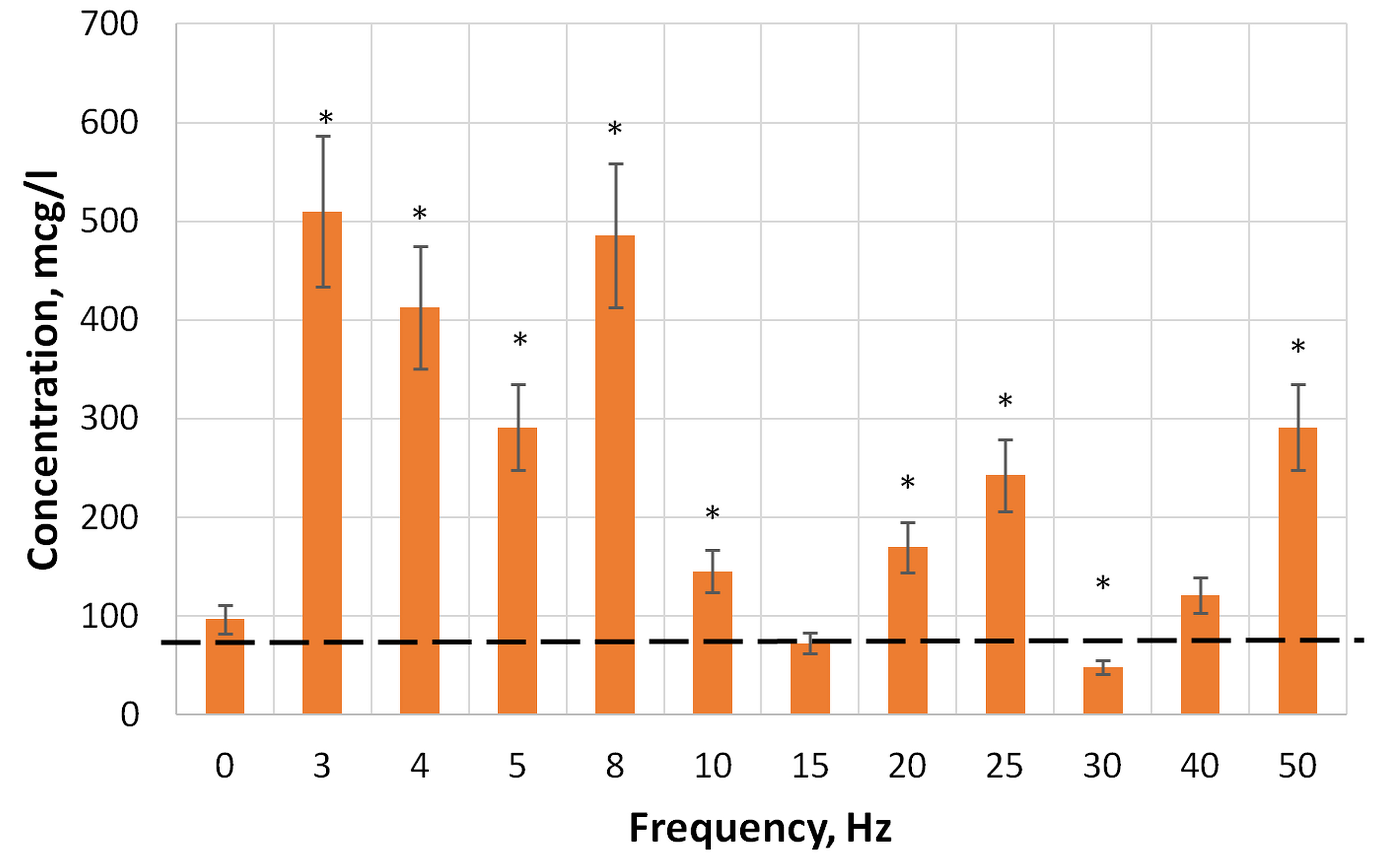 A change in the hydrogen peroxide concentration in an aqueous solution of biopolymers makes it possible to explain the observed effects as a result of the influence of the low-frequency alternating MF on biochemical processes. Thus, a significant increase in the content of hydrogen peroxide in DNA solutions following exposure to alternating magnetic fields with frequencies of 3–8 and 50 Hz (Fig. 5) leads to an increase in the level of oxidatively modified nitrogenous DNA bases. This is interesting since a significant (1.5 times) increase in the level of 8-hydroxy-2-deoxyguanosine in genomic DNA is a key biomarker of oxidative damage to nucleic acids mediated by ROS generation.