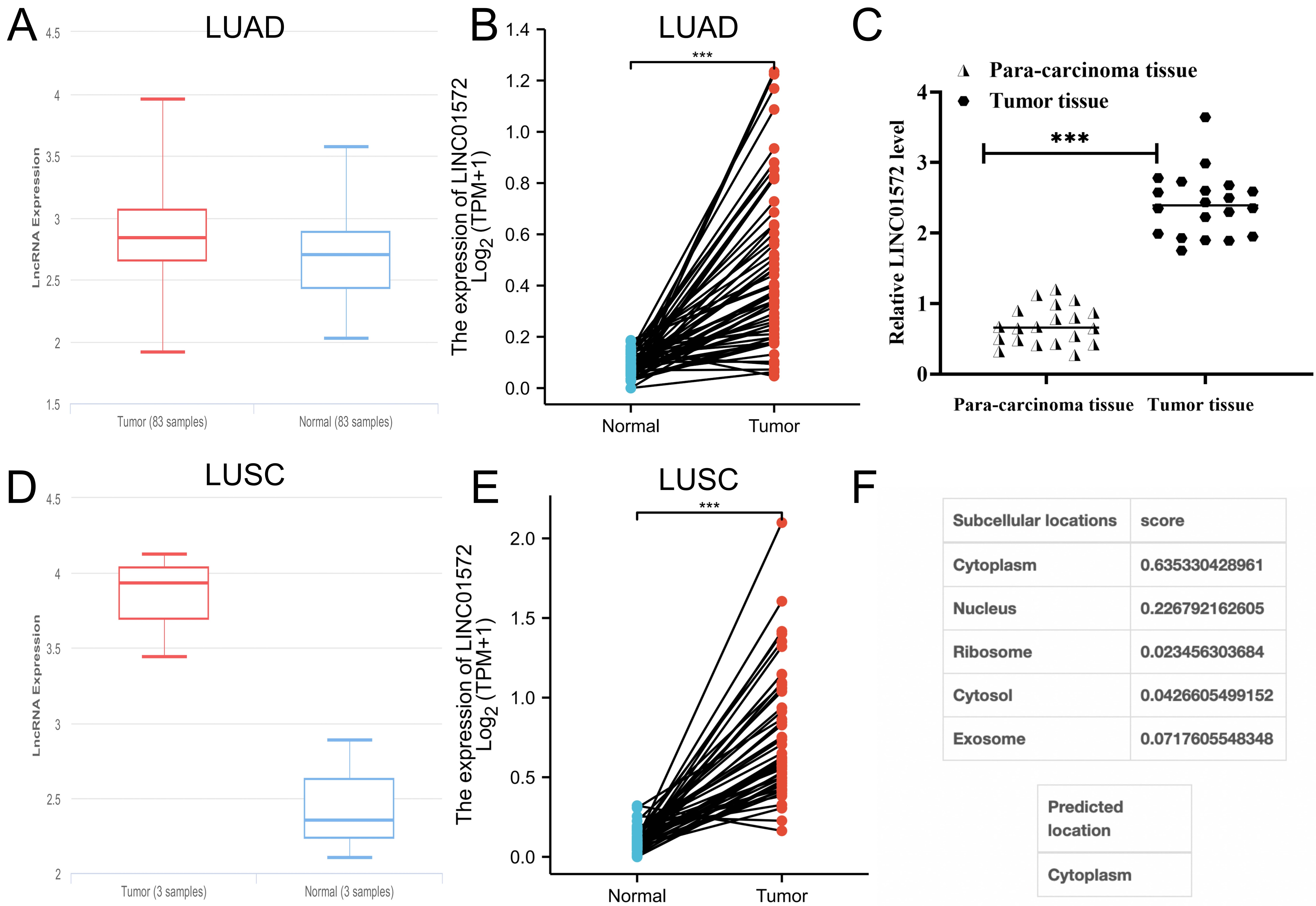 respectively. (B,E) Upregulation of LINC01572 was also observed in LUAD and LUSC