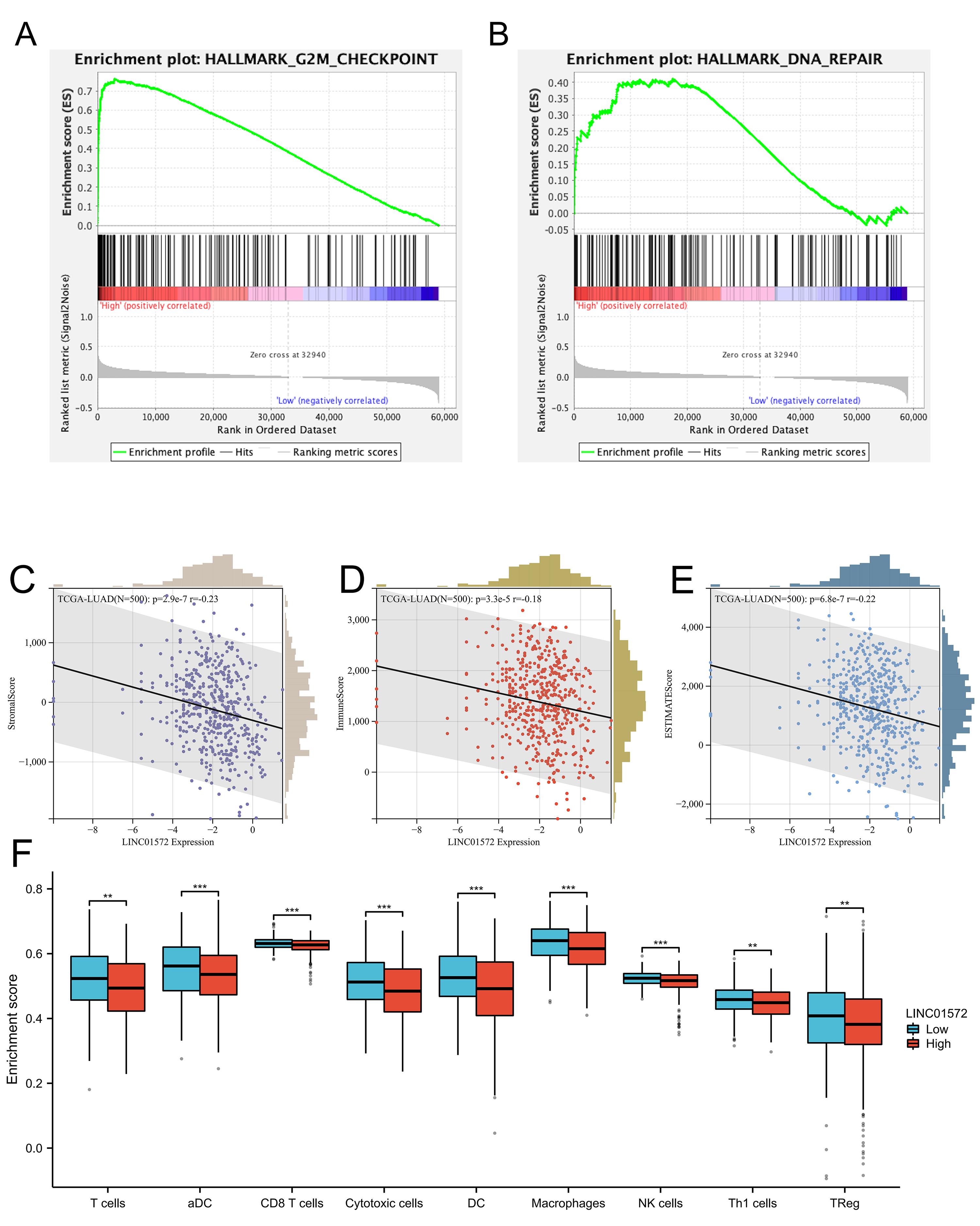 The results of GSEA showed that G2M checkpoint and DNA repair signaling pathways were significantly activated in patients with high LINC01572 expression (Fig. 3A,B). This finding suggests that enhanced tumor cell proliferation and resistance to DNA damage are the main mechanisms by which LINC01572 promotes tumor development.
