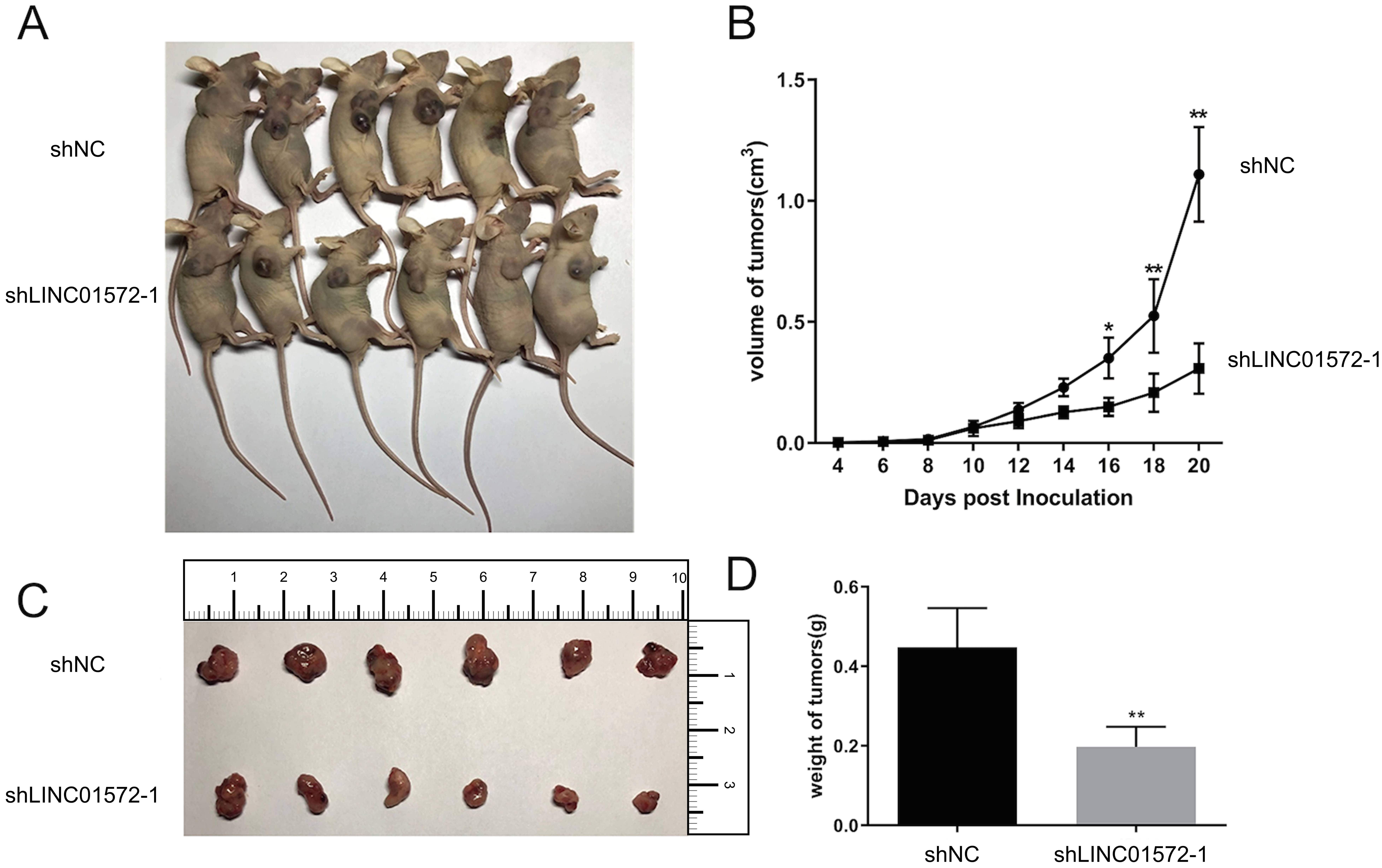 The in vivo growth rates in terms of tumor volume and weight were found to be lower in mice from the sh-LINC01572-1 group compared to the shNC group. This result suggests that blocking LINC01572 in tumor cells may reverse cancerous growth.