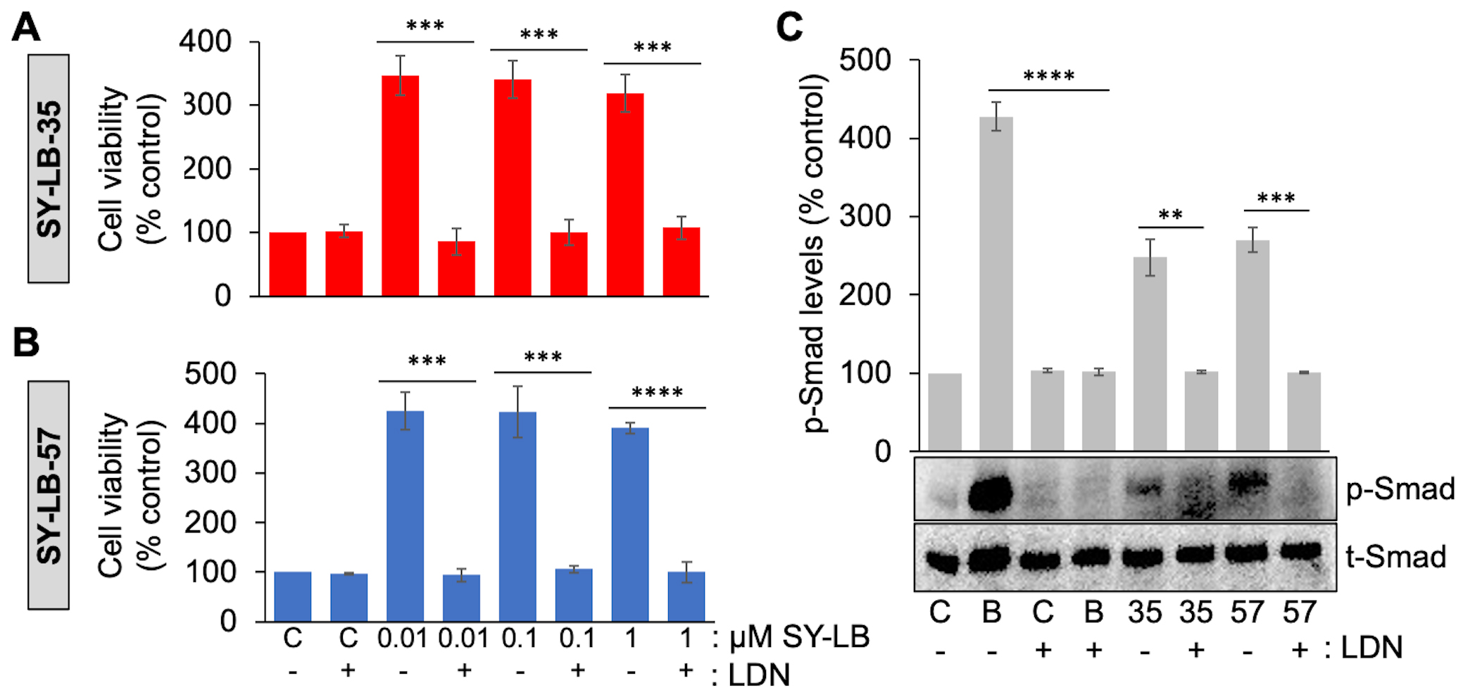and incubated for 4 hours with BMP2 (50 ng/mL) and SY-LB-35 or SY-LB-57 at 1