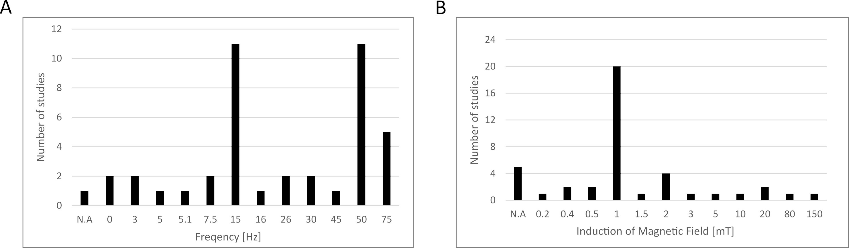 Fig. 1.Electromagnetic field parameters used in the studies collected in this review. (A) Frequency, (B) induction of magnetic field. N.A., data not available.