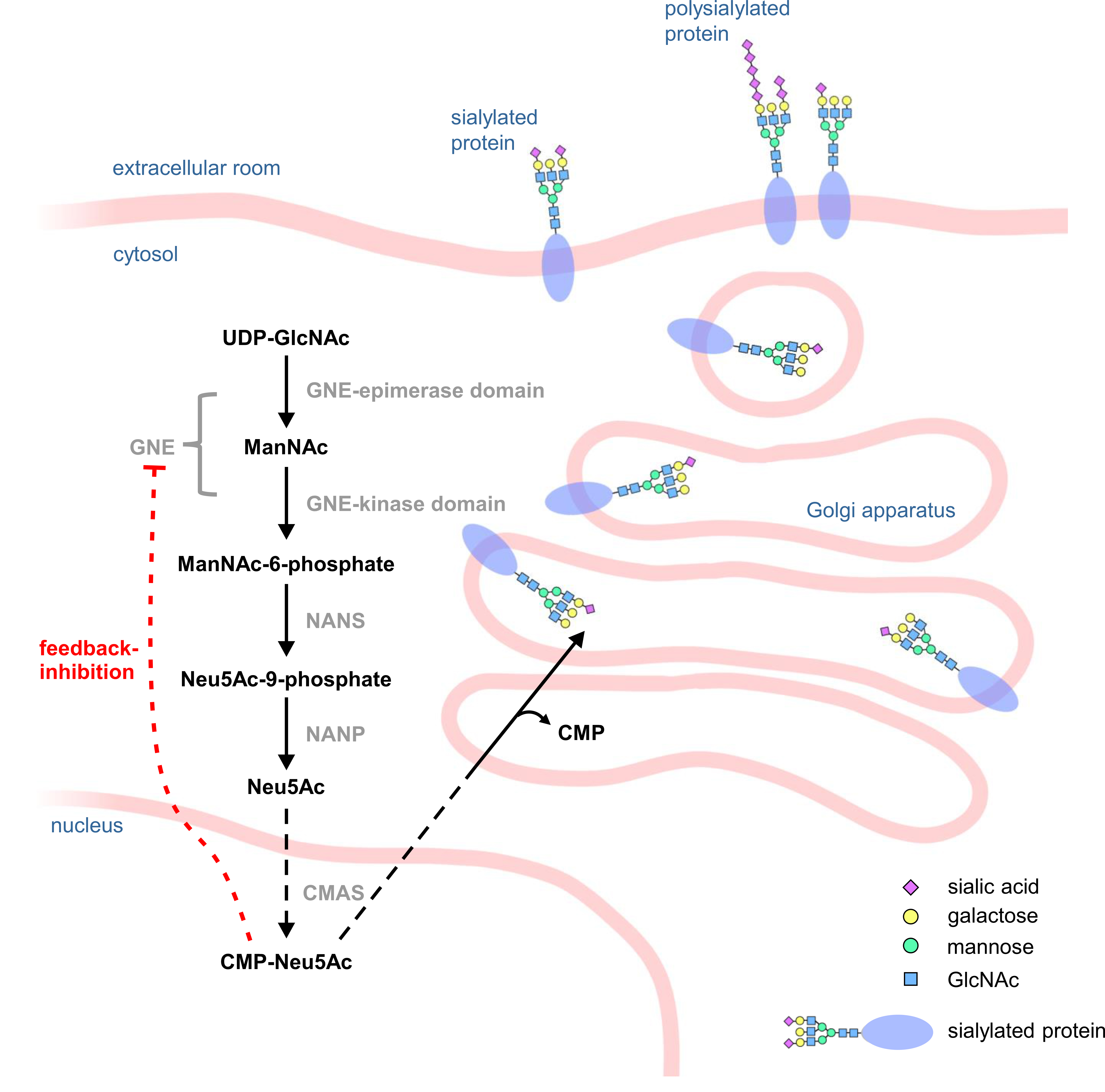 Most steps in sialic acid synthesis take place in the cytosol. The activation of N-acetylneuraminic acid (Neu5Ac) to cytidine 5′-monophospho-N-acetylneuraminic acid (CMP-Neu5Ac) takes place in the nucleus. Afterwards it is transferred to the Golgi apparatus, where it serves as a substrate for terminal protein sialylation or for polysialylation (Fig. 1) [12]. The synthesis is highly dependent on the bifunctional enzyme GNE, which catalyzes the first two steps of the synthesis and epimerizes UDP-N-acetylglucosamine (UDP-GlcNAc) to N-acetylmannosamine (ManNAc), which is then phosphorylated by GNE to ManNAc-6-phosphate. GNE itself can then be feedback inhibited by the end product of the sialic acid biosynthesis pathway, CMP-Neu5Ac, making GNE one of the major regulators of sialic acid synthesis [6].