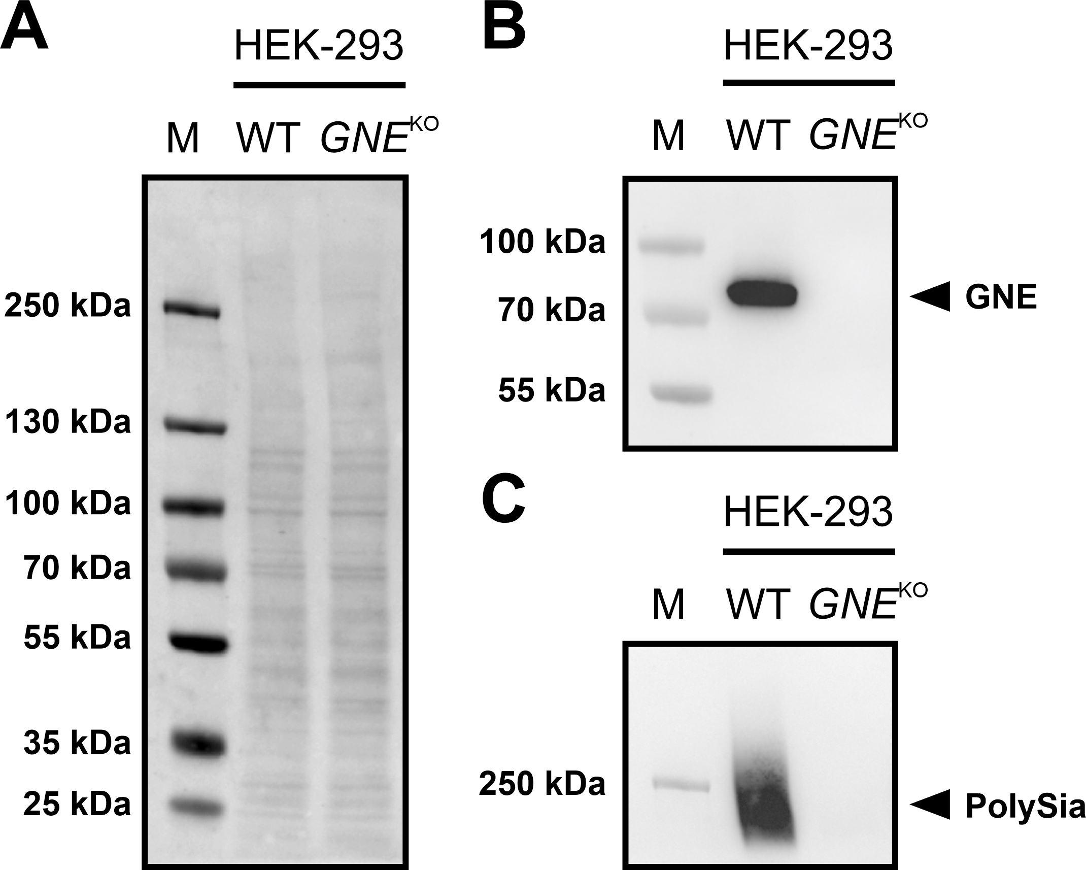 In HEK-293 WT cells, both a PolySia and a GNE signal could be detected in the