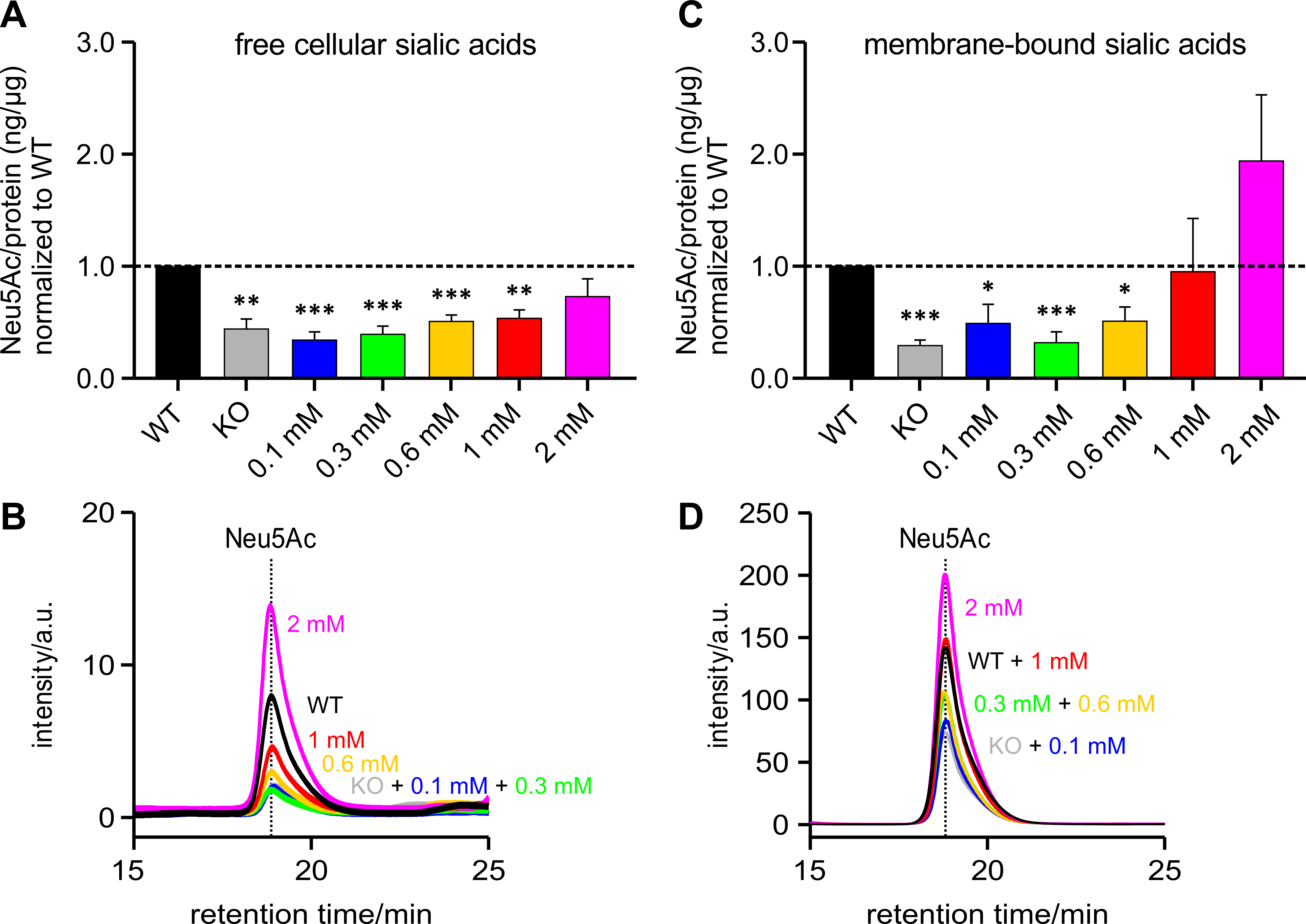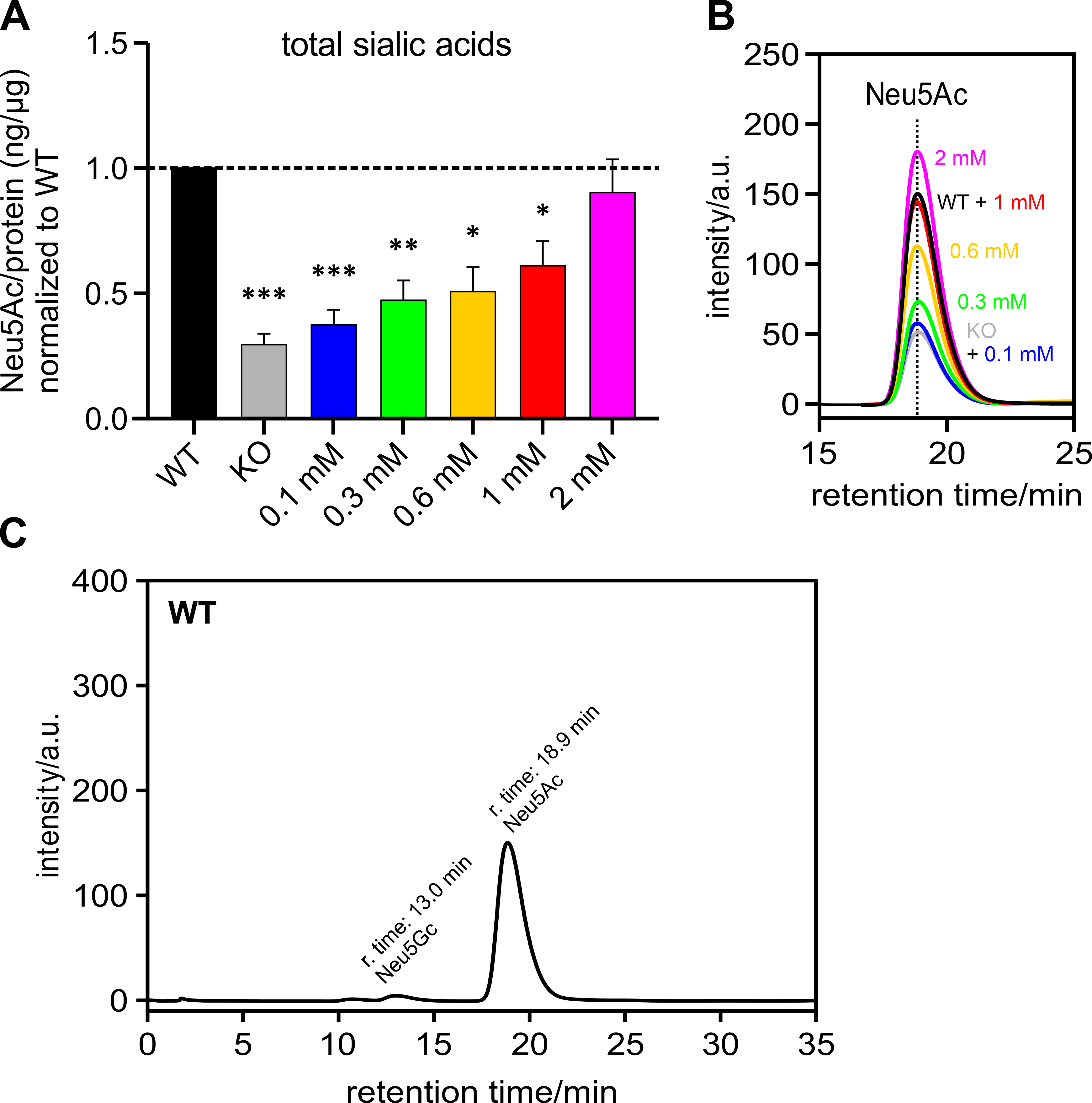Polysialic acids are the product of one form of sialylation. To understand whether the PolySia detected by immunoblot corresponds to the total cellular sialic acid content, Neu5Ac – the most abundant sialic acid – was measured by HPLC and related to the amount of protein per sample and normalized to the HEK-293 WT samples (Fig. 4A). It can be seen that the total sialic acid level also showed an increasing trend, which was associated with increasing ManNAc supplementation levels – as was the case with the PolySia signal in the immunoblot (see previous section).