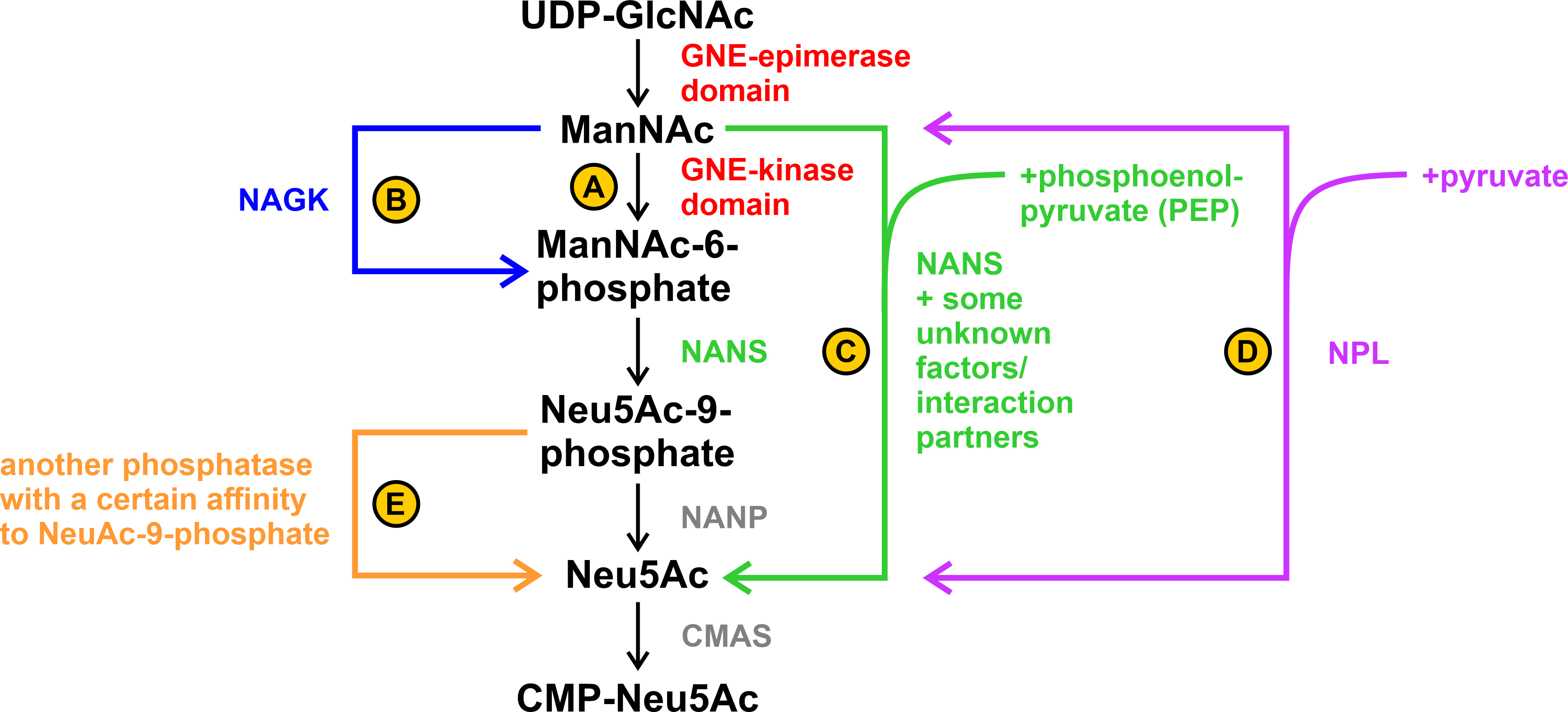 Fig. 6.Possible alternative steps in sialic acid biosynthesis. (A) ManNAc is phosphorylated by the GNE-kinase domain. (B) ManNAc is phosphorylated by the N-acetylglucosamine kinase (NAGK). (C) ManNAc is directly converted to Neu5Ac by sialic acid synthase (NANS) with the addition of phosphoenolpyruvate (PEP). Unknown tissue-specific factors/interaction partners may play a role in this. (D) ManNAc is directly converted to Neu5Ac by N-acetylneuraminate pyruvate lyase (NPL) with the addition of pyruvate. This reaction is reversible. (E) Dephosphorylation of Neu5Ac-9-phosphate to Neu5Ac occurs by an unknown phosphatase with a specific side-affinity to Neu5Ac-9-phosphate.