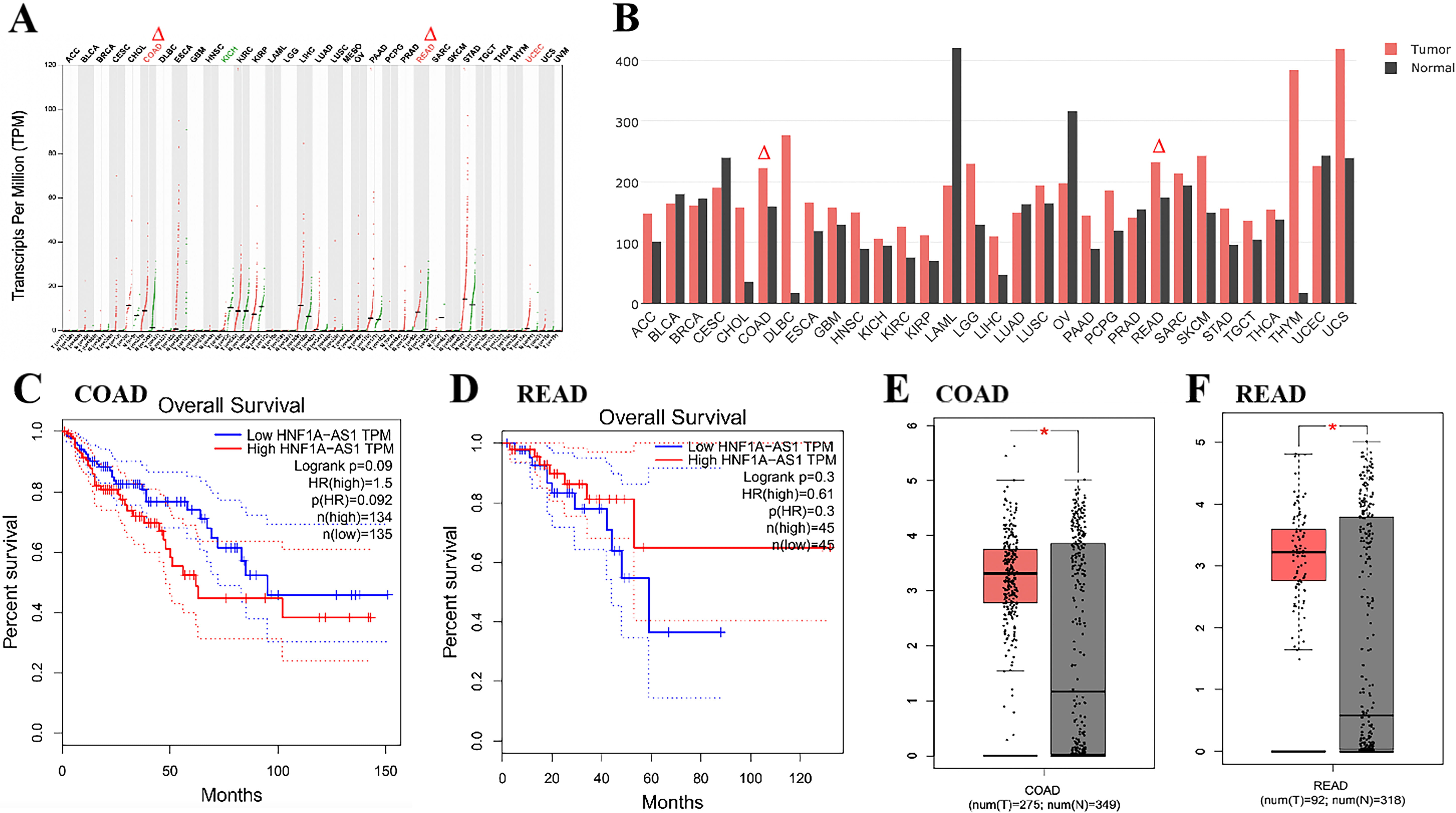 Previous studies have demonstrated that HNF1A-AS1 is a potential long noncoding RNA which regulates tumor progression. Using the TCGA database, we analyzed the expression of HNF1A-AS1 in 33 different tumors and adjacent tissues. In addition, we analyzed the expression of HNF1A-AS1 in colon cancer and rectal cancer tissues and corresponding para-cancer tissues and its association with overall survival (OS). We further verified differences in HNF1A-AS1 expression in colon cancer and rectal cancer in relative para-cancer tissues in the two databases.