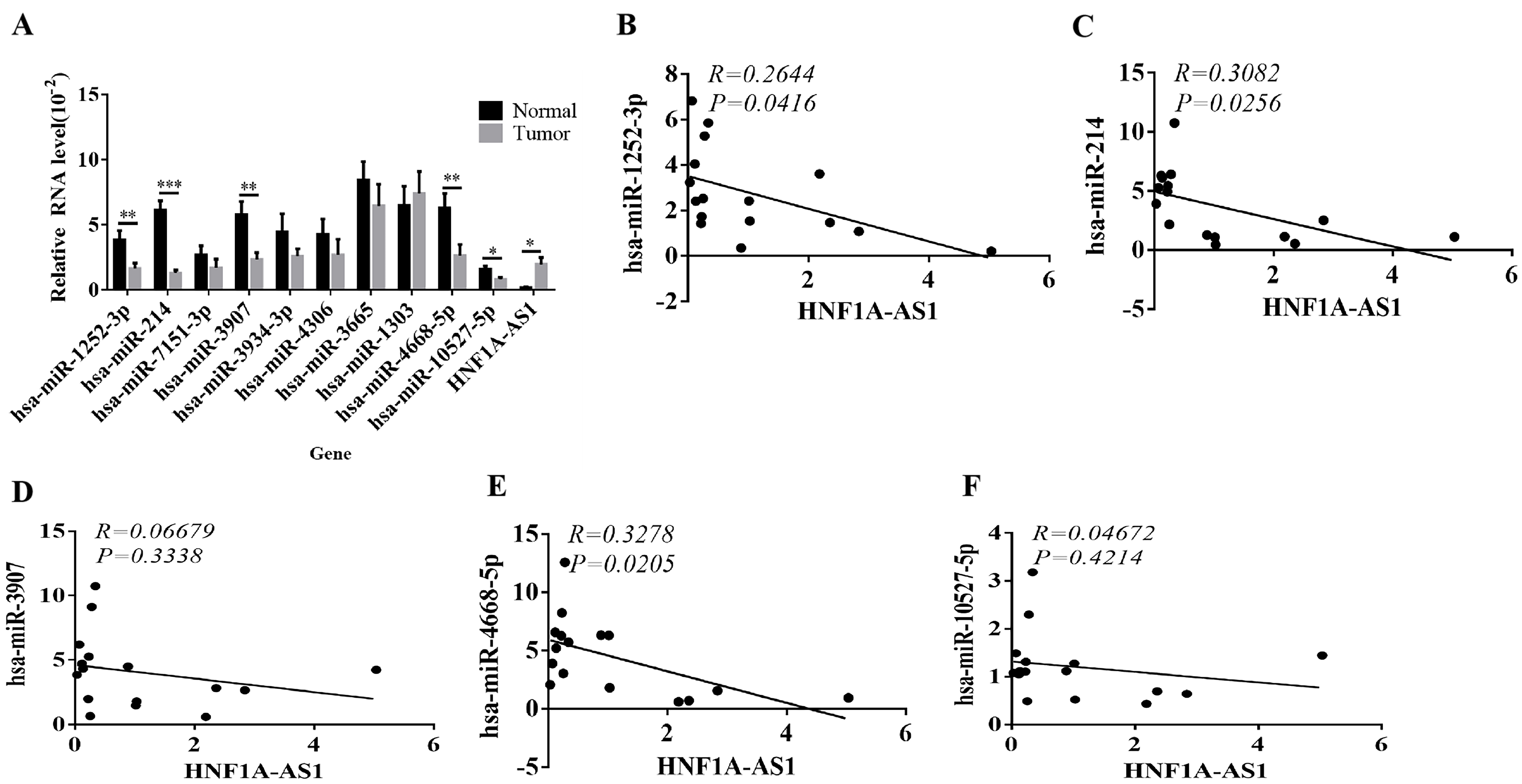 The relative expression of miRNAs, which is tightly linked with HNF1A-AS1, was detected by RT-qPCR in clinical CRC and para-cancer tissues. Subsequently, the association between differentially expressed miRNAs and HNF1A-AS1 was analyzed.