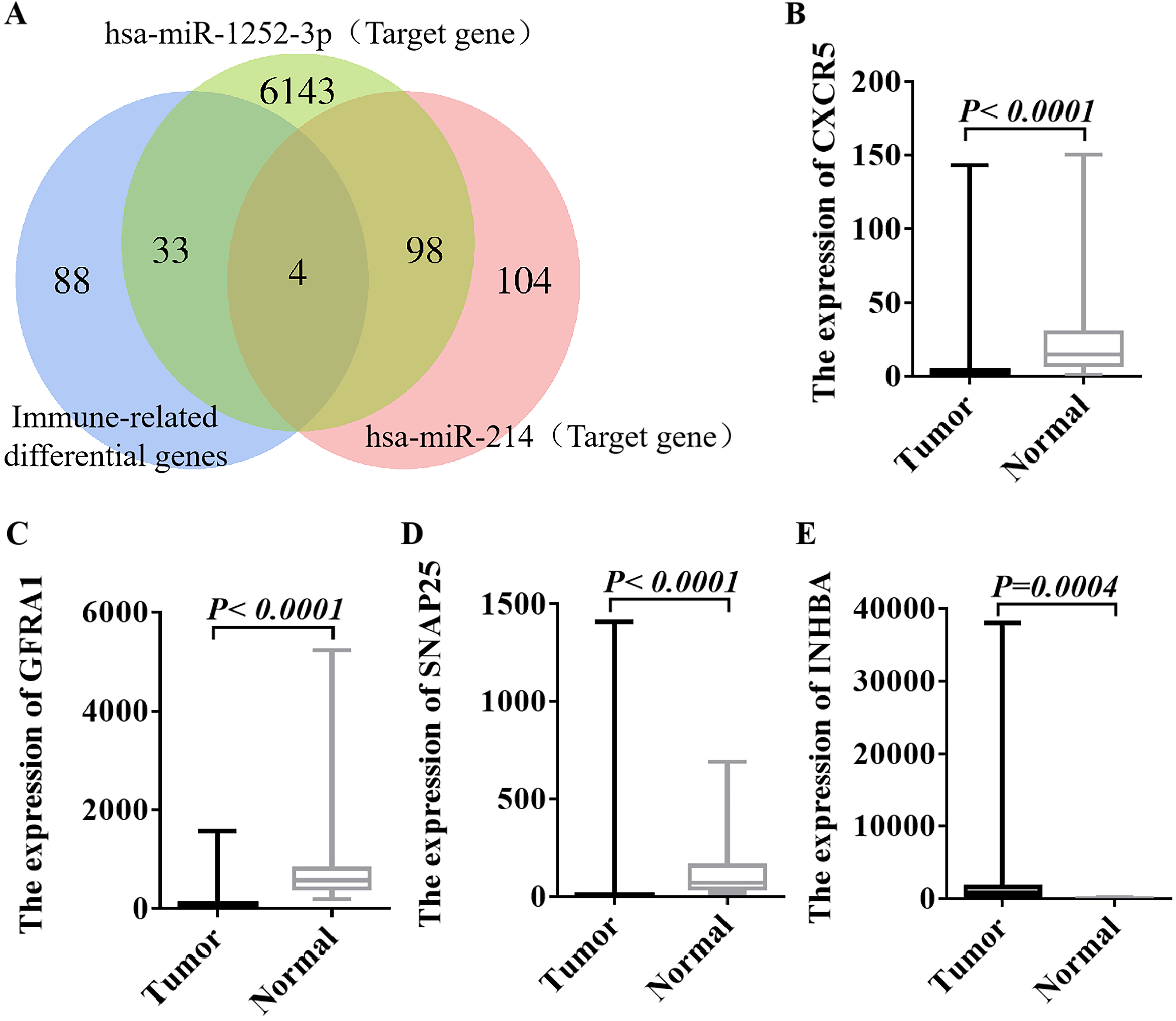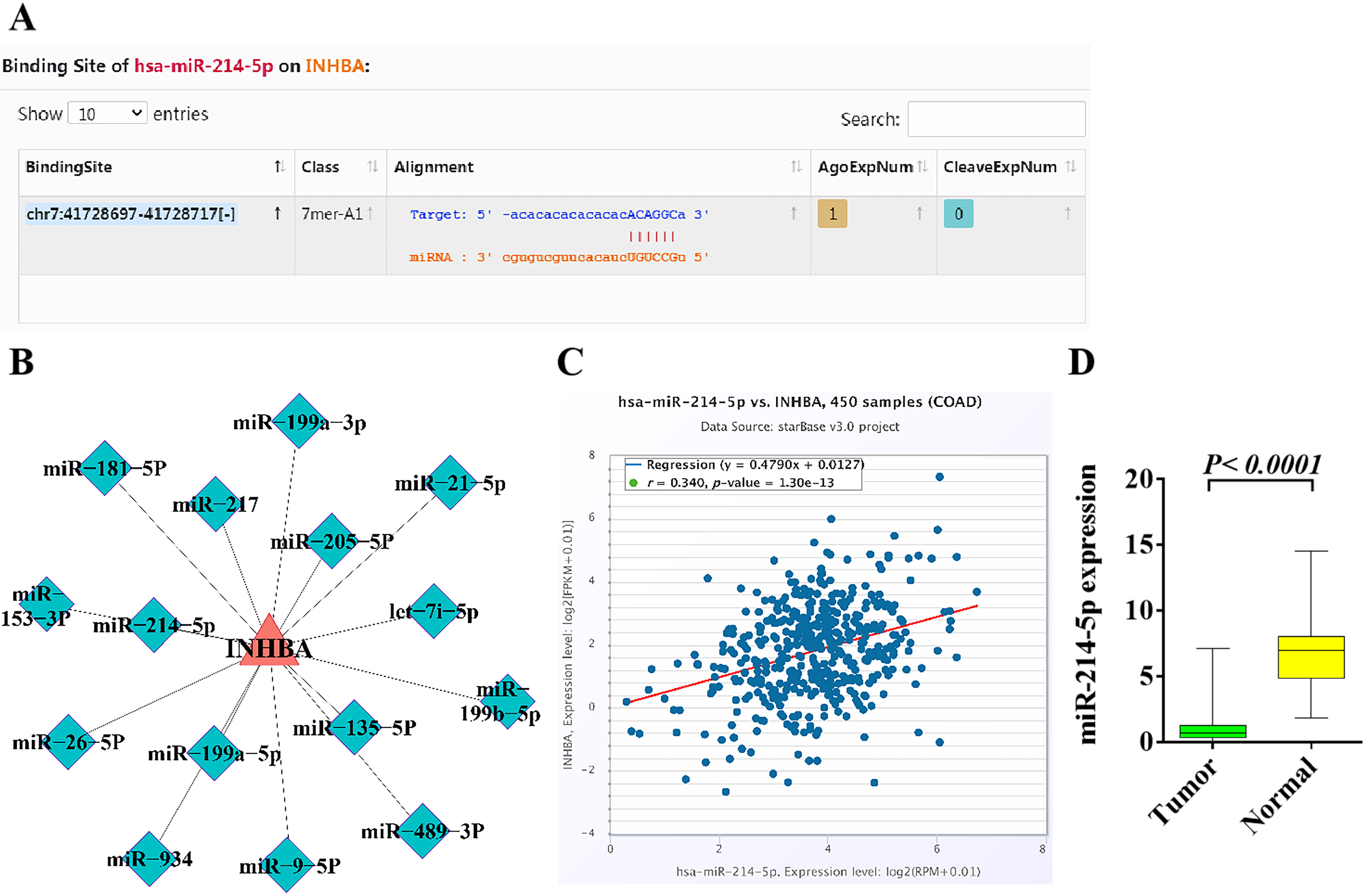 The miRDB, miRWalk, and TargetScan databases were utilized to predict the target genes of hsa-miR-214. RT-qPCR was used to detect the relative expression level of target genes located in the overlapping region. The relative expression levels of INHBA in CRC and para-cancer tissues were analyzed from the TCGA database. In addition, the expression of INHBA at different stages of CRC and its association with disease-free survival (DFS) and OS were analyzed.