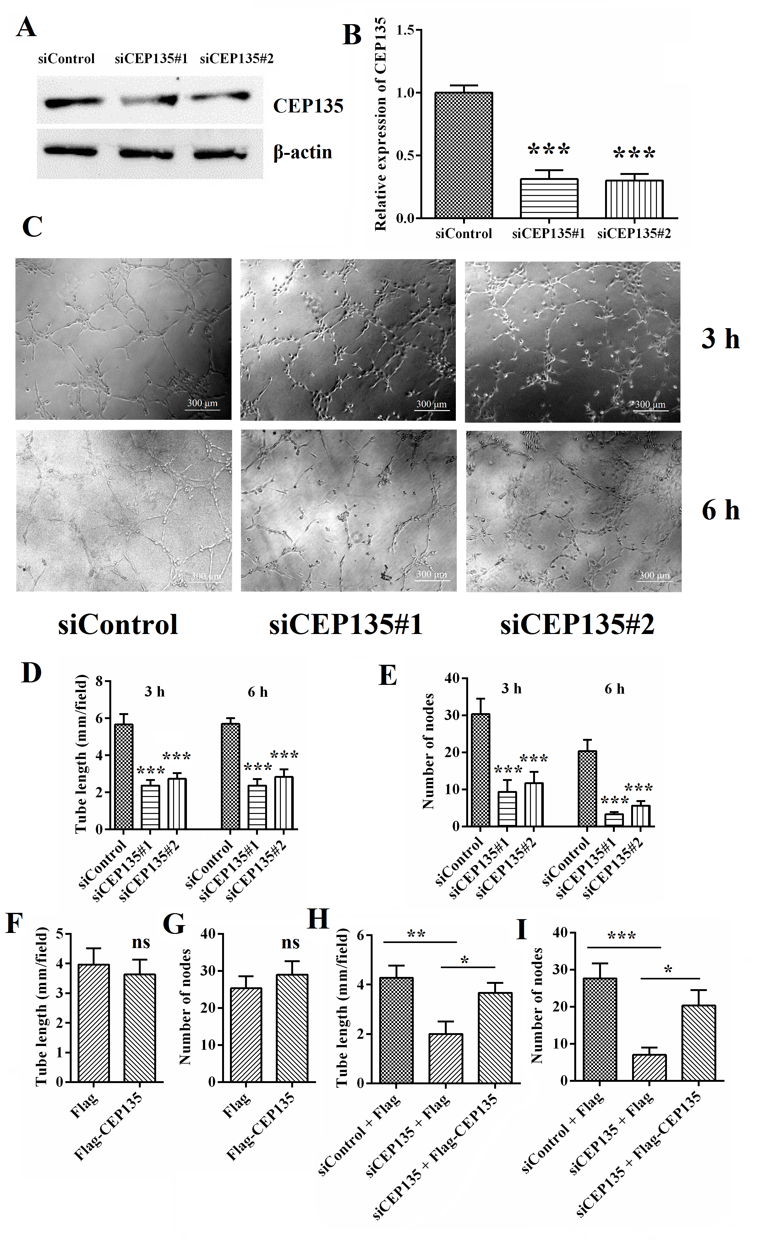 To investigate whether CEP135 is essential for angiogenesis, the present study examined the effect of CEP135 siRNAs on vascular endothelial tube formation in vitro. Two different siRNAs were used to target the CDS region of CEP135 mRNA and therefore induce the knockdown of CEP135, and both were able to effectively knockdown CEP135 expression in HUVECs (Fig. 1A,B). After plating cells for 3 or 6 h, a tubular network of interconnecting branches was observed in the control siRNA group; in contrast, fewer tubes were detected in the CEP135 siRNA groups (Fig. 1C). The accumulated tube length and node numbers at 3 h were measured as an index of angiogenesis (Fig. 1D,E). In addition, a CEP135 overexpression plasmid was transfected into HUVECs, and its efficiency was confirmed by western blotting (Supplementary Fig. 1). CEP135 overexpression had modest effects on the angiogenesis of HUVECs, with only slight changes in tube length and node numbers (Fig. 1F,G and Supplementary Fig. 2). However, overexpression of CEP135 rescued the inhibition of angiogenesis in HUVECs caused by CEP135 knockdown (Fig. 1H,I). These findings indicated that CEP135 was essential for angiogenesis.