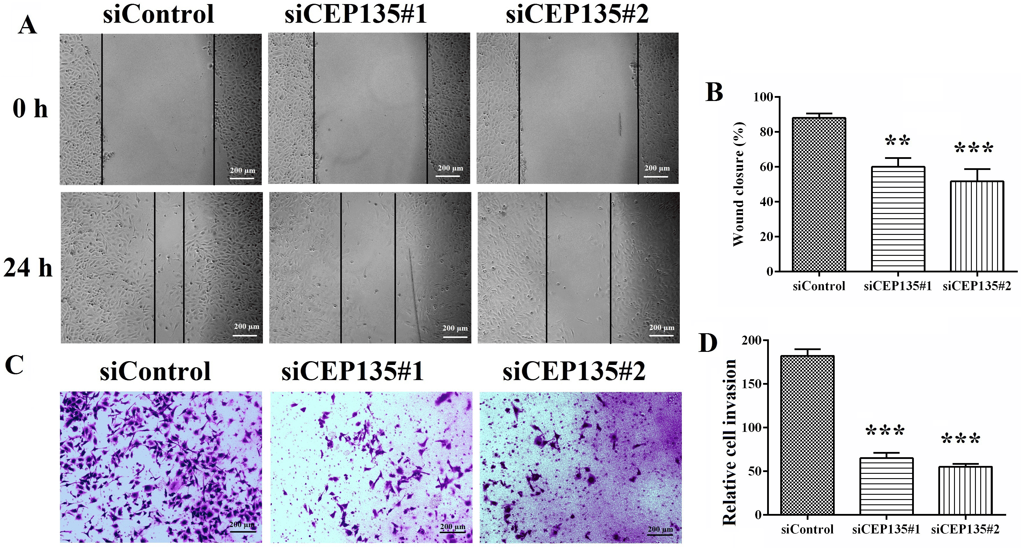 HUVECs transfected with siControl or siCEP135 were scratched, and images of the