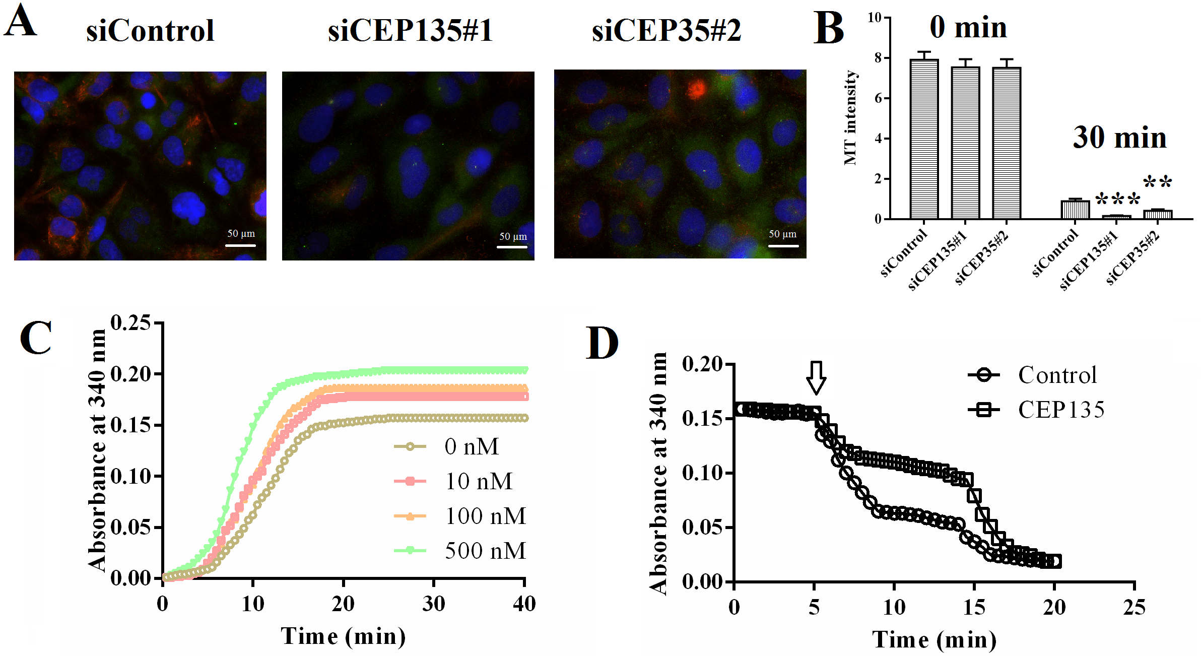 Tubulin (5 mg/mL; Cytoskeleton, Inc., Califonia, USA) and purified His-CEP135 proteins (100 nM; Guidechem, Nanjing, China) were added to a 96-well plate on ice and then transferred to a spectrophotometer. The polymerization was monitored by measuring the absorbance (350 nm). Spontaneously assembled microtubules with or without His-CEP135 (100 nM) at 37 °C were diluted with PBS, followed by shifting the temperature from 20 °C to 4 °C, according to a previous study [21].