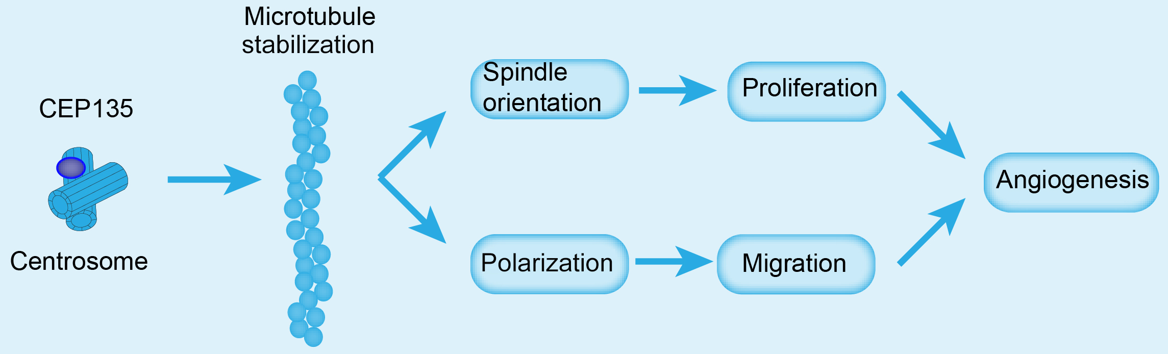 Angiogenesis refers to the process of sprouting of new blood vessels from existing vessels, which is regulated by a number of proangiogenic and inhibitory factors [4]. In adults, angiogenesis is virtually nonexistent [4]. This process often occurs in pathological processes, such as retinopathy of prematurity, tumor development and metastasis. Despite some understanding of angiogenesis, the relationship between centrosomes and endothelial angiogenesis is still poorly understood [7]. At present, some proteins that can be located in the centrosome, such as CEP70, have been reported to promote angiogenesis, and an in-depth understanding of this process is helpful to further reveal the pathogenesis of angiogenesis and related diseases [22]. The present study revealed that a centrosomal protein, CEP135, could serve as a regulator of angiogenesis.