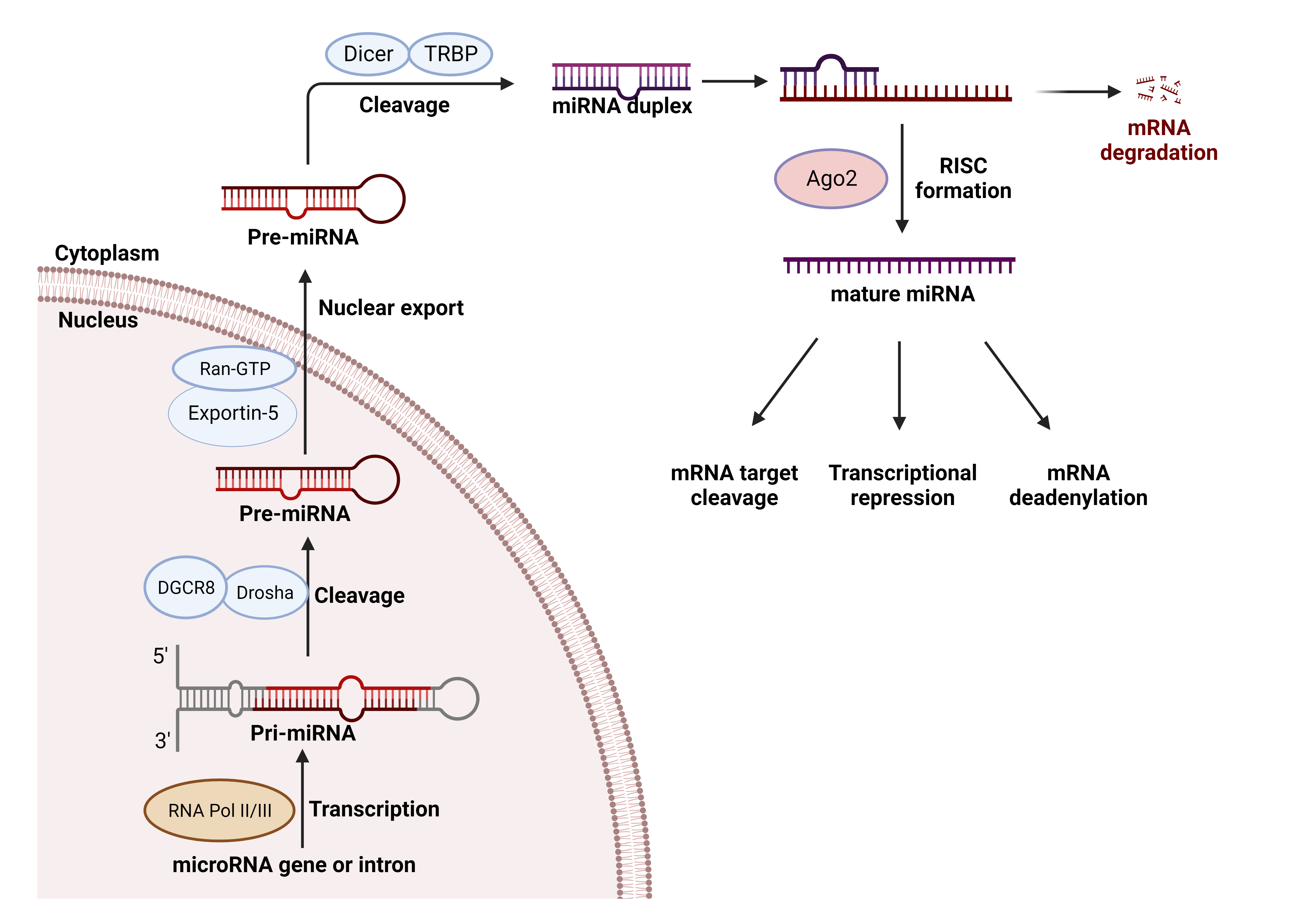 Fig. 1.The biogenesis steps of microRNAs (miRNAs). The miRNA biogenesis involves several steps, including transcription, pri-miRNA processing, export to the cytoplasm, dicer processing, strand selection, and target recognition and regulation. After several sequential process, the pre-miRNA is recognized in the cytoplasm, and cleaved by Dicer, and miRNA duplex is generated. In the final step, the guide strand of the miRNA duplex is preferentially selected and loaded onto an argonaute (AGO) protein within the RNA-induced silencing complex (RISC). The miRNA-loaded RISC complex recognizes target mRNA molecules through base pairing, usually resulting in mRNA degradation or translational repression. Figure created with biorender.com. GTP, Guanosine triphosphate; mRNA, messenger RNA.