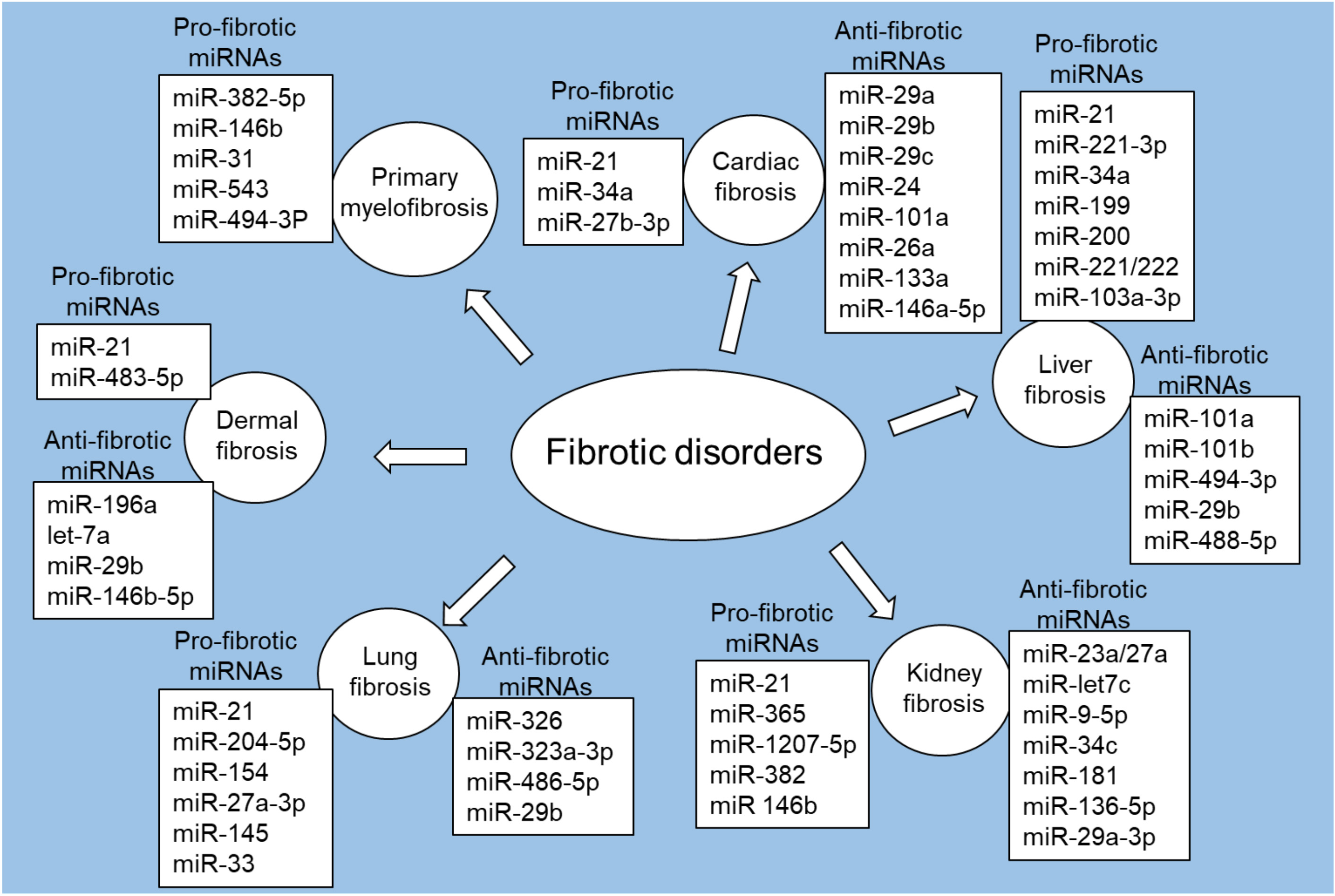 Fig. 2.Pro-fibrotic and anti-fibrotic miRNAs in fibrotic disorders. Figure created with biorender.com.
