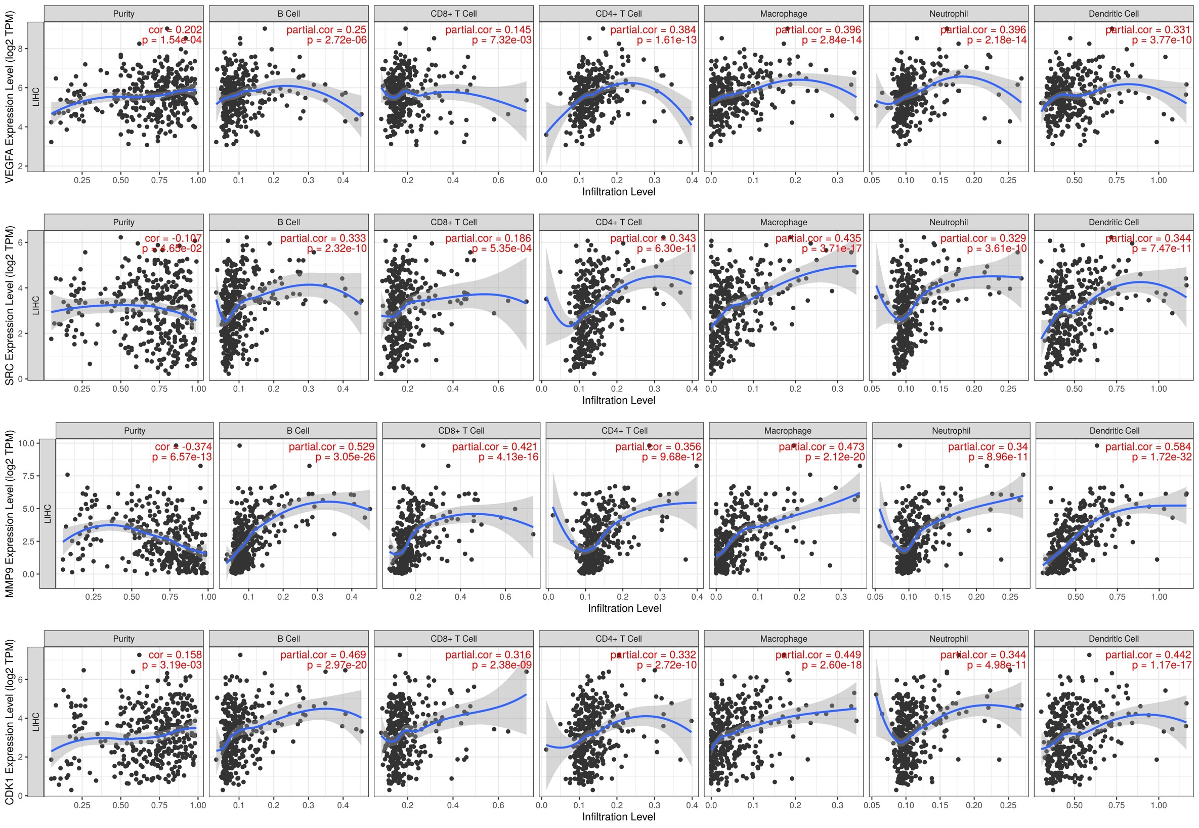 Due to the critical roles of tumor-infiltrating immune cells in the survival outcomes of LIHC patients, it is important to examine the correlation of the expression levels of the four key hub genes (VEGFA, SRC, MMP9, and CDK1) with the tumor-infiltrating levels of immune cells, as well as the expression of immune checkpoint-associated genes.