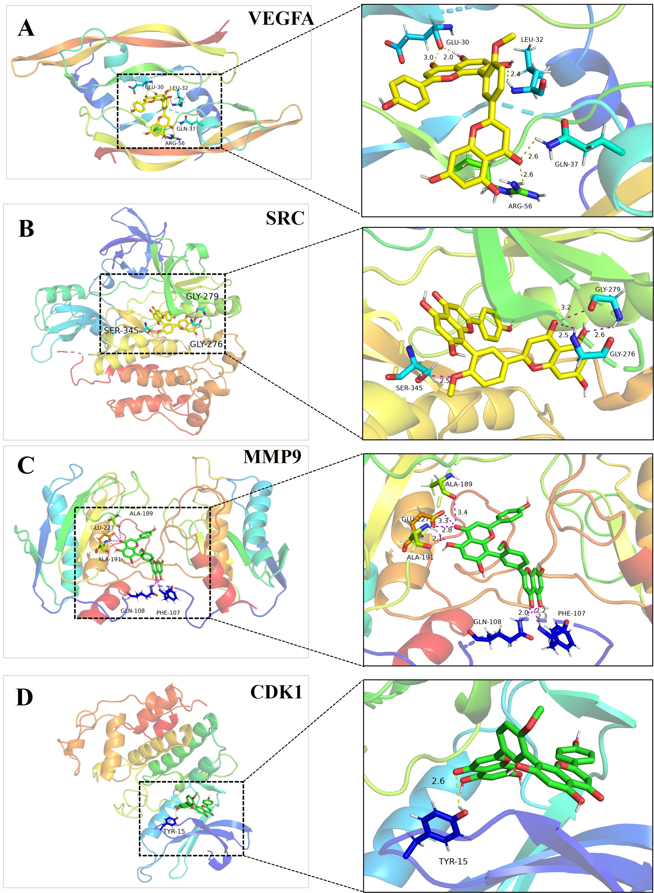 Fig. 14.The formation of hydrogen bonds in the binding complex of bilobetin and proteins encoded by target genes. The key residues that contributed to the formation of hydrogen bonds and the distance between bilobetin and residues were measured and labeled. Left: the overall structure of proteins used for molecular docking. Right: the detailed interaction between bilobetin and its target proteins. (A) VEGFA; (B) SRC; (C) MMP9; (D) CDK1.