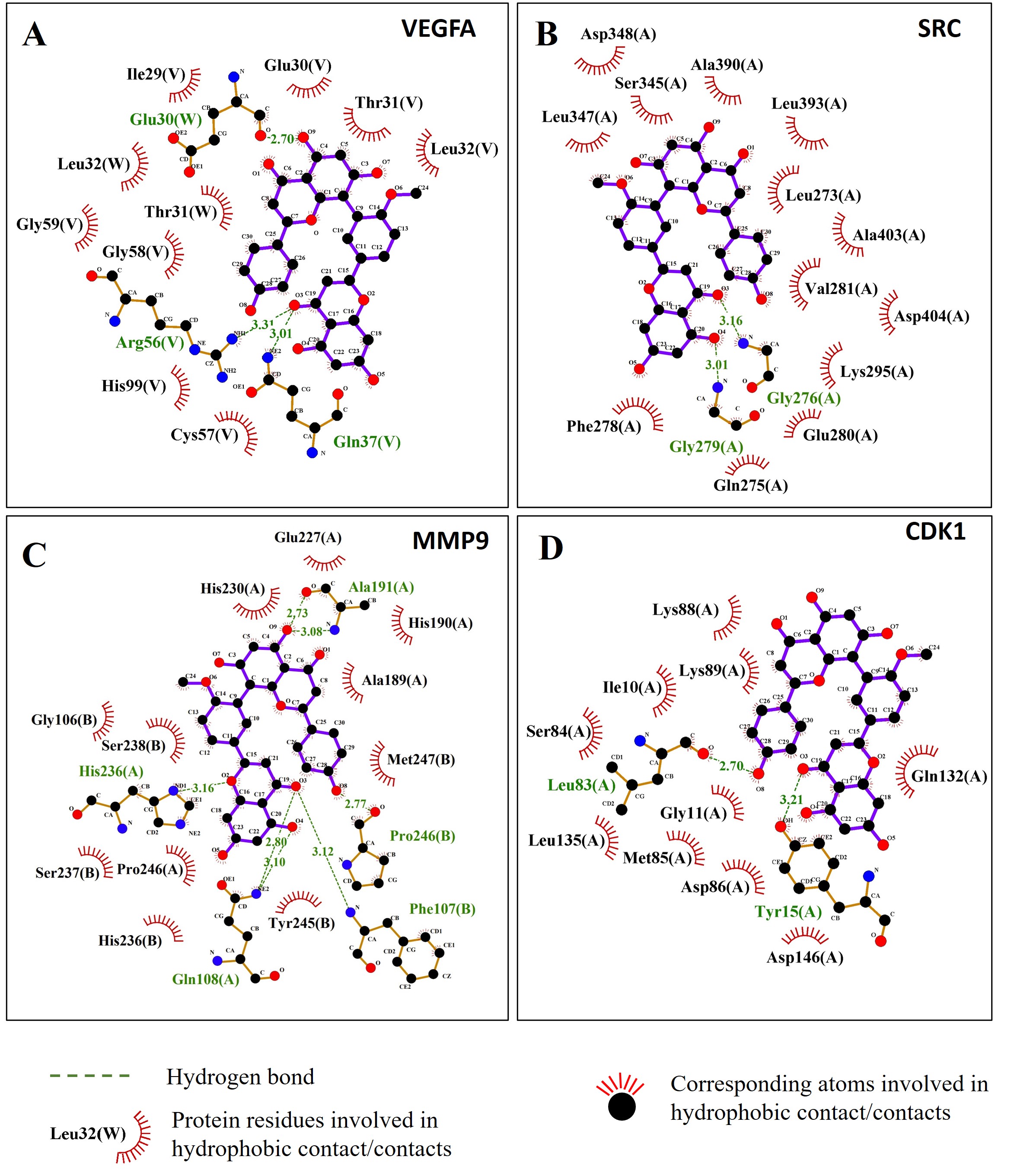 Fig. 15.The 2D interaction results showed hydrophobic interactions between bilobetin and four target proteins. (A) VEGFA; (B) SRC; (C) MMP9; (D) CDK1.