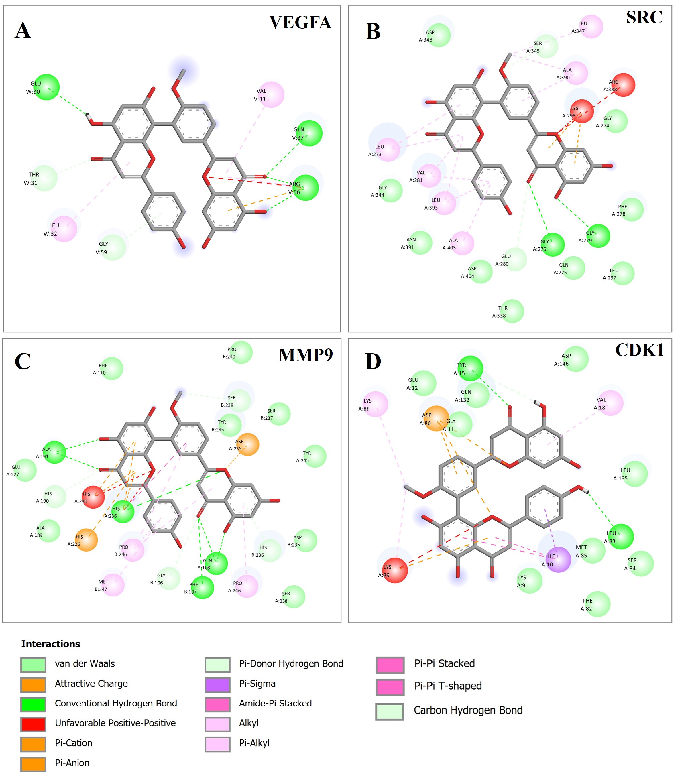 Fig. 16.The 2D interaction analysis results of bilobetin and the target proteins. The figure presents all the interactions between bilobetin and its target proteins that contribute to the formation of the protein-ligand complexes. (A) VEGFA; (B) SRC; (C) MMP9; (D) CDK1.