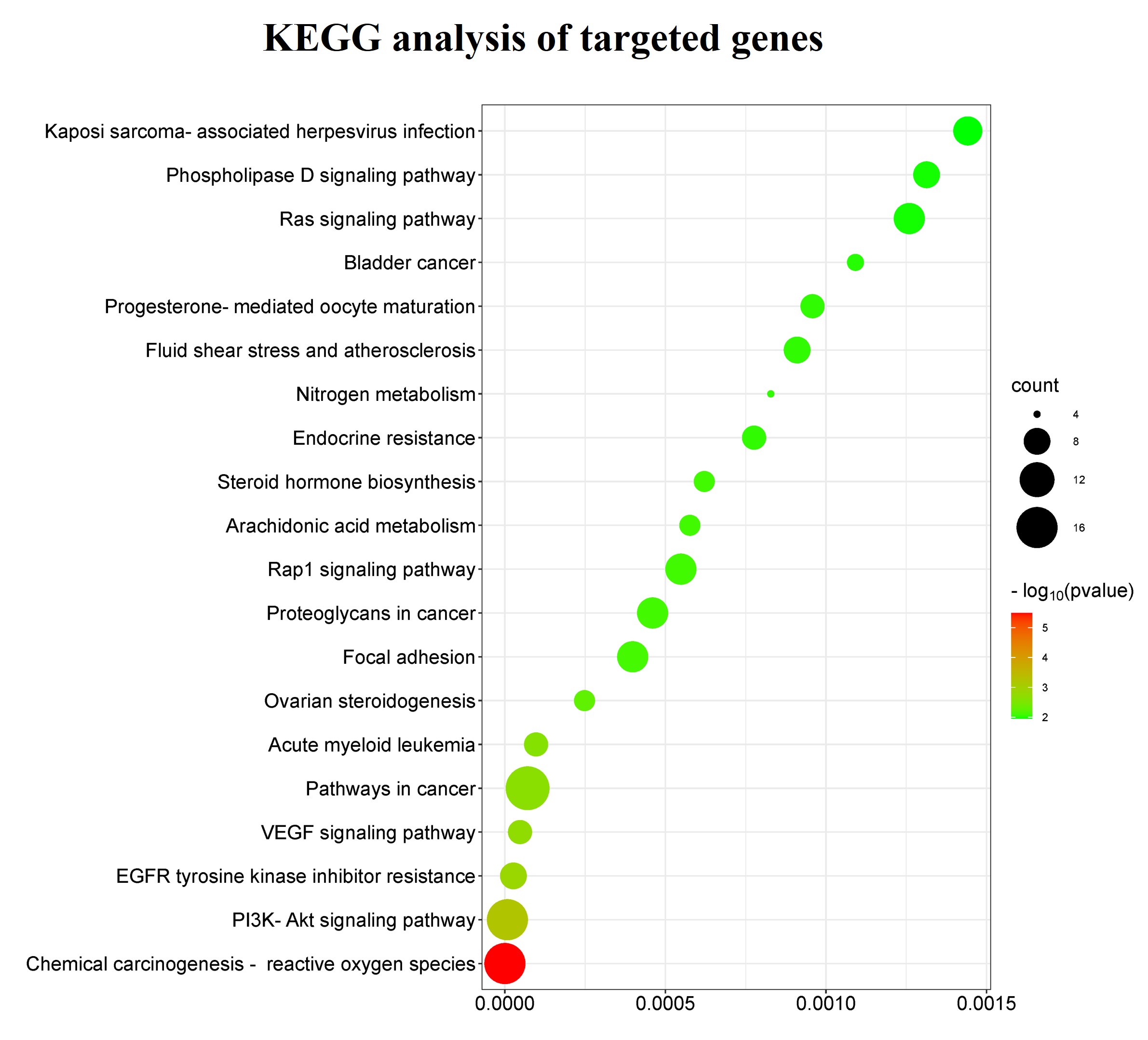 To better understand the major roles of these targeted genes in signaling pathways and diseases, we further performed a KEGG analysis and the top 20 enriched signaling pathways are shown (Fig. 3). The results showed that these genes played critical roles in chemical carcinogenesis-reactive oxygen species, pathways in cancer, acute myeloid leukemia, bladder cancer, and proteoglycan in cancer. The enriched signaling pathways of target genes were the RAS signaling pathway, PI3K-AKT signaling pathway, VEGF signaling pathway, and EGFR tyrosine kinase inhibitor resistance.
