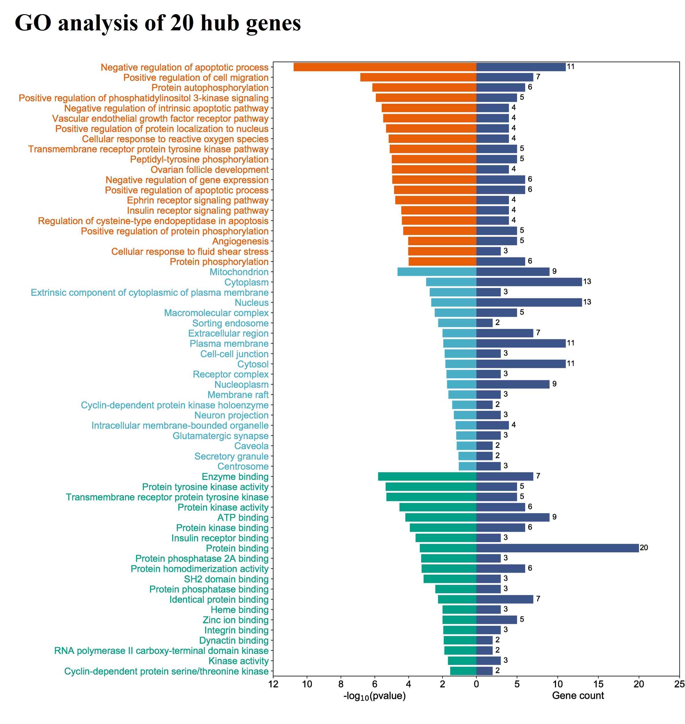 To further test whether the top 20 hub genes represent the main functions of target genes, the examination of functional enrichment and signaling pathways of these hub genes was carried out. The results of GO functional enrichment analysis revealed that, for biological processes, 20 hub genes were highly enriched in the following pathways including negative regulation of the apoptotic process, positive regulation of cell migration, protein autophosphorylation, positive regulation of phosphatidylinositol 3-kinase signaling pathway, negative regulation of the intrinsic apoptotic pathway, vascular endothelial growth factor receptor pathway, positive regulation of protein localization to nucleus, cellular response to reactive oxygen species, transmembrane receptor protein tyrosine kinase pathway, and peptidyl-tyrosine phosphorylation (Fig. 5). Regarding the cellular component, these hub genes were found to have greater enrichment in the mitochondrion, cytoplasm, the extrinsic component of cytoplasmic membrane, nucleus, macromolecular complex, sorting endosome, extracellular region, plasma membrane, cell-cell junction, cytosol, etc. (Fig. 5). The results of the molecular function demonstrated that the hub genes were highly enriched in the function of enzyme binding, protein tyrosine kinase activity, transmembrane receptor protein tyrosine kinase, protein kinase activity, ATP binding, protein kinase binding, insulin receptor binding, protein binding, protein phosphatase 2A binding, protein homodimerization activity, and other molecular function processes (Fig. 5).
