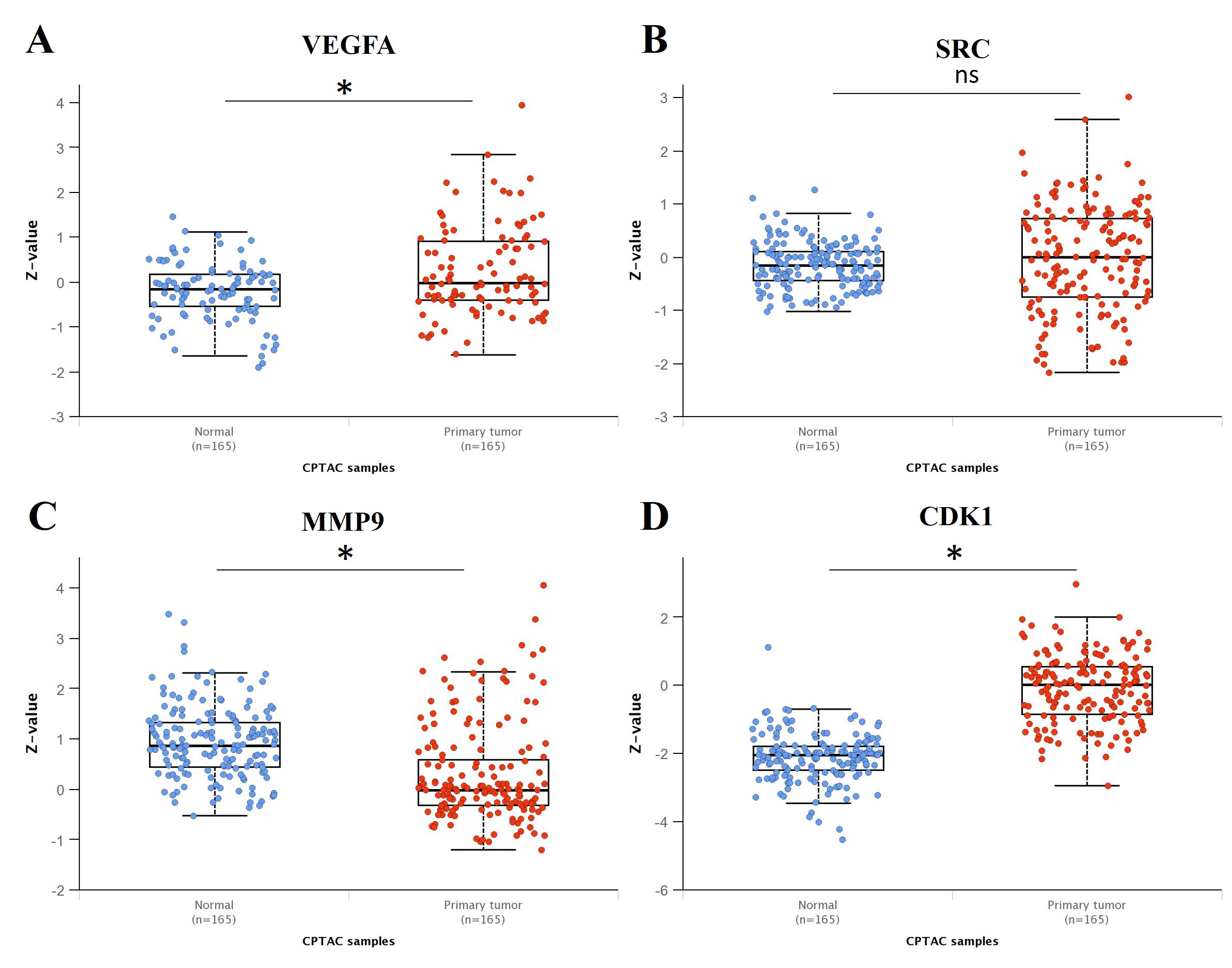 To analyze the proteomic expression levels of four genes, including VEGFA, SRC, MMP9, and CDK1, we used the Clinical Proteomic Tumor Analysis Consortium (CPTAC) database to compare their proteomic expression levels between normal samples and primary LIHC tumor samples. Our results showed that the proteomic expression levels of VEGFA, MMP9, and CDK1 have significantly different. However, there was no statistically significant difference in the proteomic expression levels of SRC between normal and LIHC tumor samples (Fig. 9).