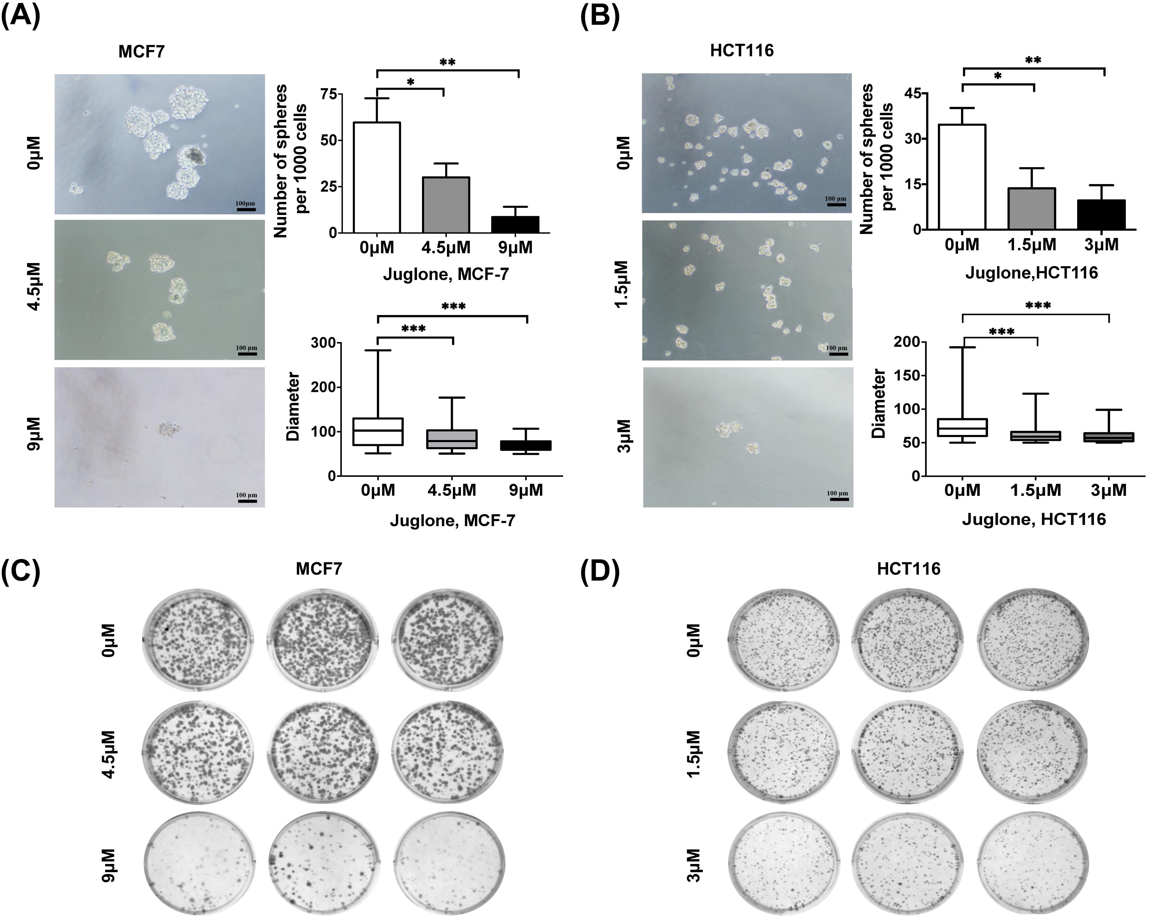 Juglone suppresses the self-renewal ability of different cancer cells. (A,B) MCF7 and HCT116 cells were treated with indicated doses of juglone and cultured in serum-free media under non-adherent conditions for 7 days. Scale bar, 100 μm. (C,D) A colony formation assay was performed, culture plates were stained with crystal violet. *p < 0.05, **p < 0.01, ***p < 0.001.