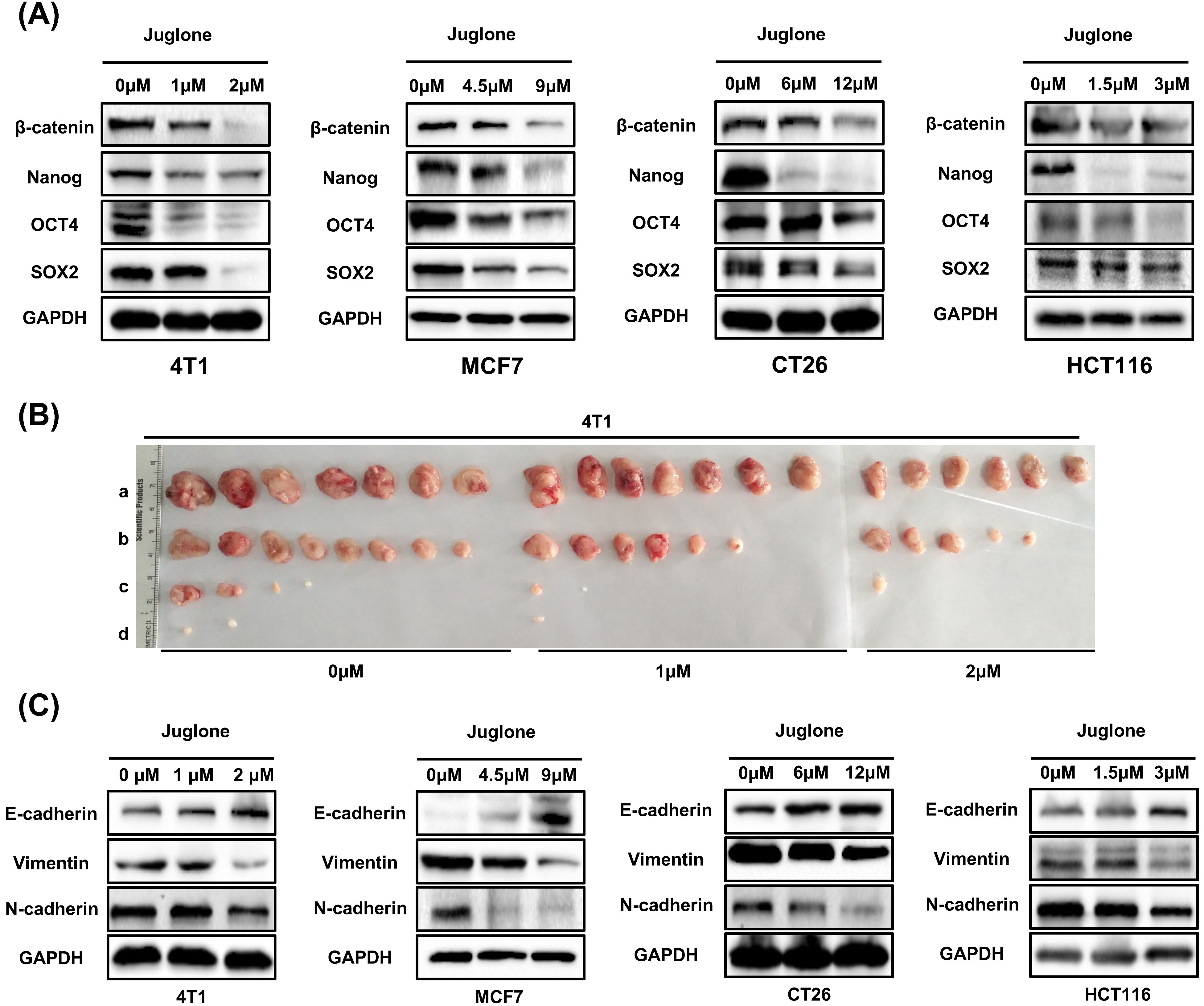 Juglone suppresses stemness characteristics and EMT in cancer cells. (A) The expression of β-catenin, Nanog, OCT4 and SOX2 in breast and colorectal cancer cells was assessed by western blot analysis after juglone treatment. (B) The cells were treated with 0 μM, 1 μM and 2 μM of juglone for 24 hours, and serially diluted as 1 × 107/mL, 1 × 106/mL, 1 × 105/mL, 1 × 104/mL prior to injection into mice. Then the cells of four densities were subcutaneously injected with 100 μL of cell suspension in the bilateral axillary and groin of the same mouse. The mice were sacrificed 3 weeks after inoculation and the tumors were removed to evaluate the tumorigenicity. (C) The expression of E-cadherin, vimentin and N-cadherin was tested by western blot analysis after juglone treatment.