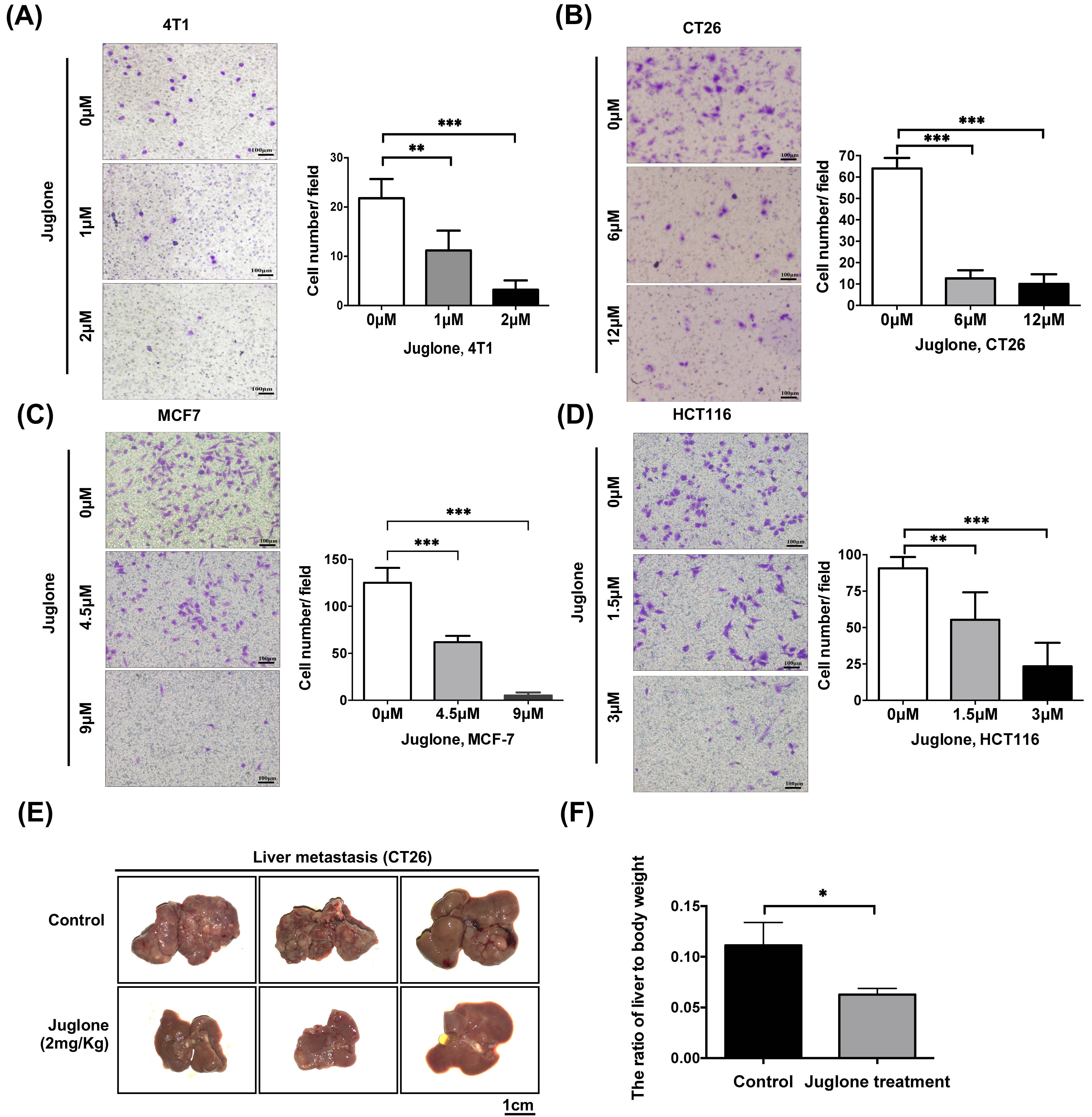 Juglone inhibits cancer cells metastasis both in vitro and in vivo. (A–D) Breast cancer cells (4T1, MCF7) and colorectal cancer cells (CT26, HCT116) were treated with indicated doses of juglone for 24 hours and subsequently counted and seeded into the chambers (1 × 105 cells for 4T1, 2 × 104 cells for MCF7, 2 × 104 cells for CT26 and 1 × 105 cells for HCT116). After 24 hours the cells passing through the chamber stained with 0.1% crystal violet and counted. Scale bar, 100 μm. (E) Liver metastasis model was established by injecting 1 × 106 CT26 cells into spleen of every mouse. The mice were treated with either PBS or 2 mg/kg juglone by intraperitoneal injection every other day for 14 days. Mice were subsequently sacrificed, and the liver was removed to evaluate metastasis. Scale bar, 1 cm. (F) The ratio of liver weight vs. body weight were decreased in juglone treatment group compare with control group. *p < 0.05, **p < 0.01, ***p < 0.001.