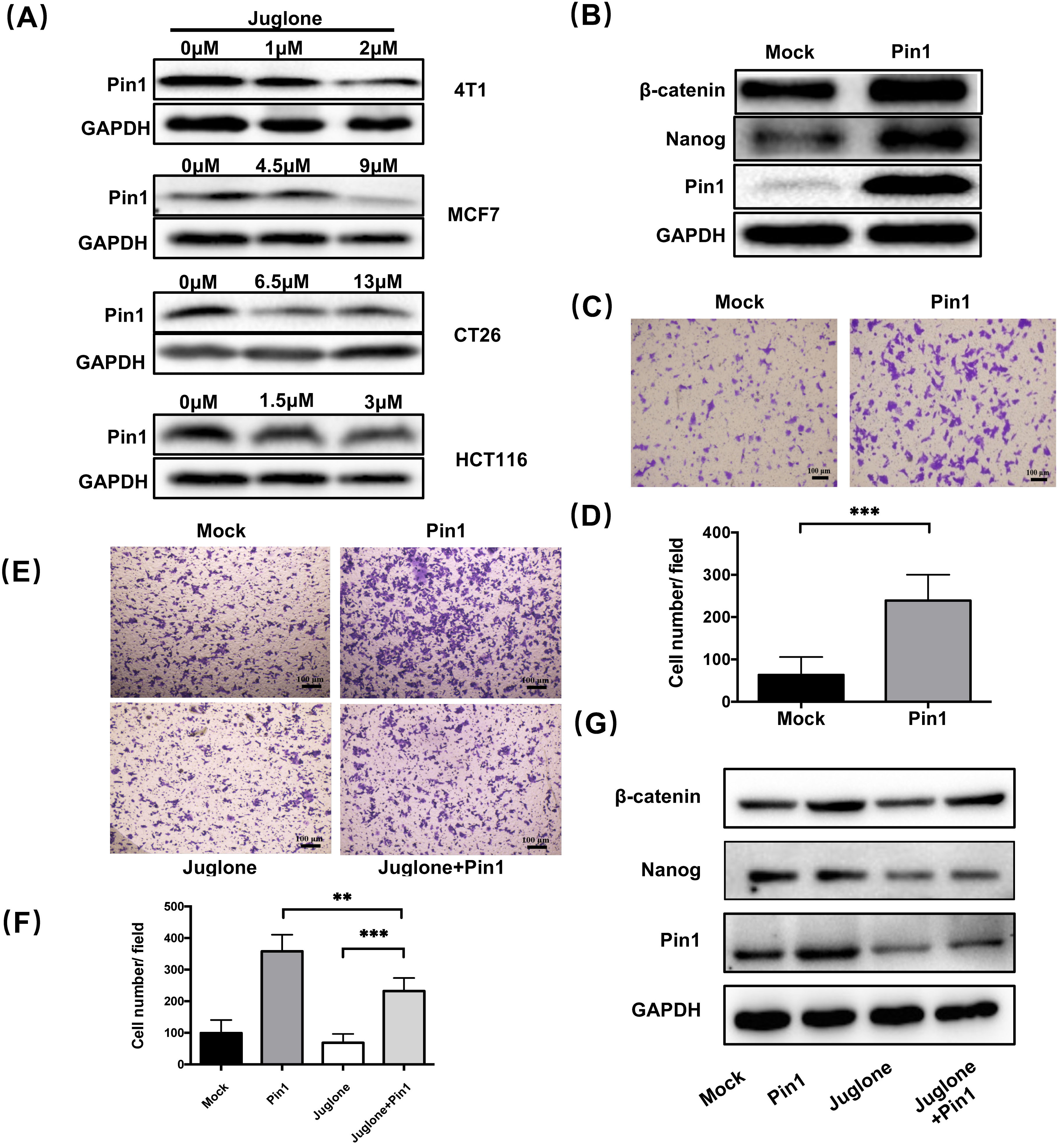 Juglone suppresses the stemness characteristics of cancer cells through inhibiting Pin1. (A) The expression of Pin1 in four cell lines treated with different concentrations of juglone was assayed by western blot analysis. (B) HCT116 was transfected with either pLVX-DsRed vector (Mock group) or pLVX-Pin1 vector (Pin1 group). The expression of β-catenin, Nanog and Pin1 was assessed by western blot analysis. (C,D) A transwell migration assay was performed with transfected HCT116 cells. 1 × 105 cells were seeded into the chambers. After 24 hours, the cells passing through the chamber stained with 0.1% crystal violet and counted. Scale bar, 100 μm. (E,F) Pin1-overexpressing HCT116 cells were treated with or without juglone (3 μM). 1 × 105 cells were seeded into the chambers. After 24 hours, the cells passing through the chamber stained with 0.1% crystal violet and counted. Scale bar, 100 μm. (G) HCT116 was transfected with either pLVX-DsRed vector (Mock group) or pLVX-Pin1 vector (Pin1 group). And then these cells were treated with or without juglone. The expression of β-catenin, Nanog and Pin1 in the cells described above was assayed by western blot analysis. **p < 0.01, ***p < 0.001.