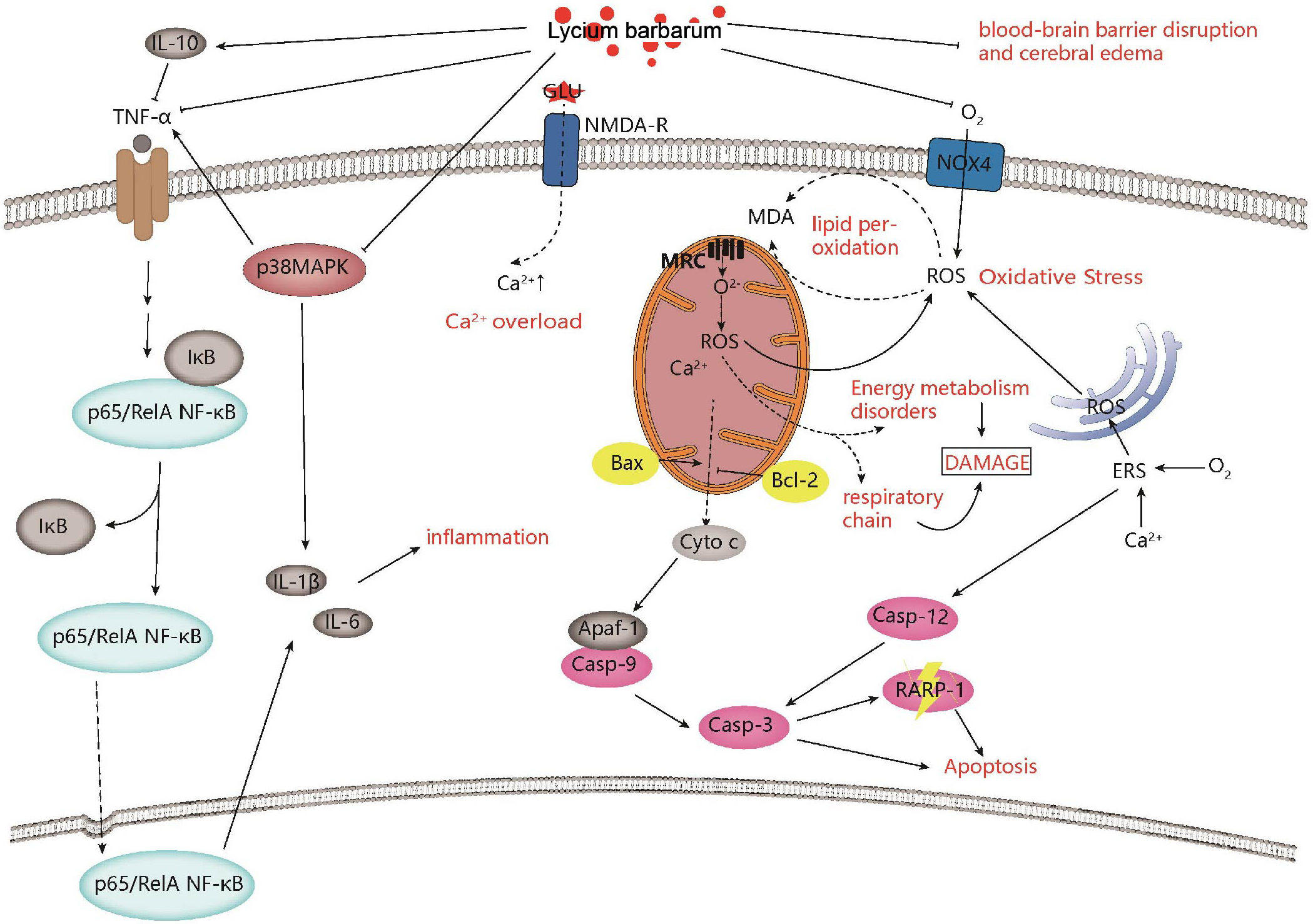 Fig. 1.Neuroprotective effects and mechanisms of Lycium barbarum on ischemic stroke. Lycium barbarum shows neuroprotective effects against ischemic stroke by improving inflammation, regulating calcium levels, improving mitochondrial function, inhibiting apoptosis, and improving oxidative stress.