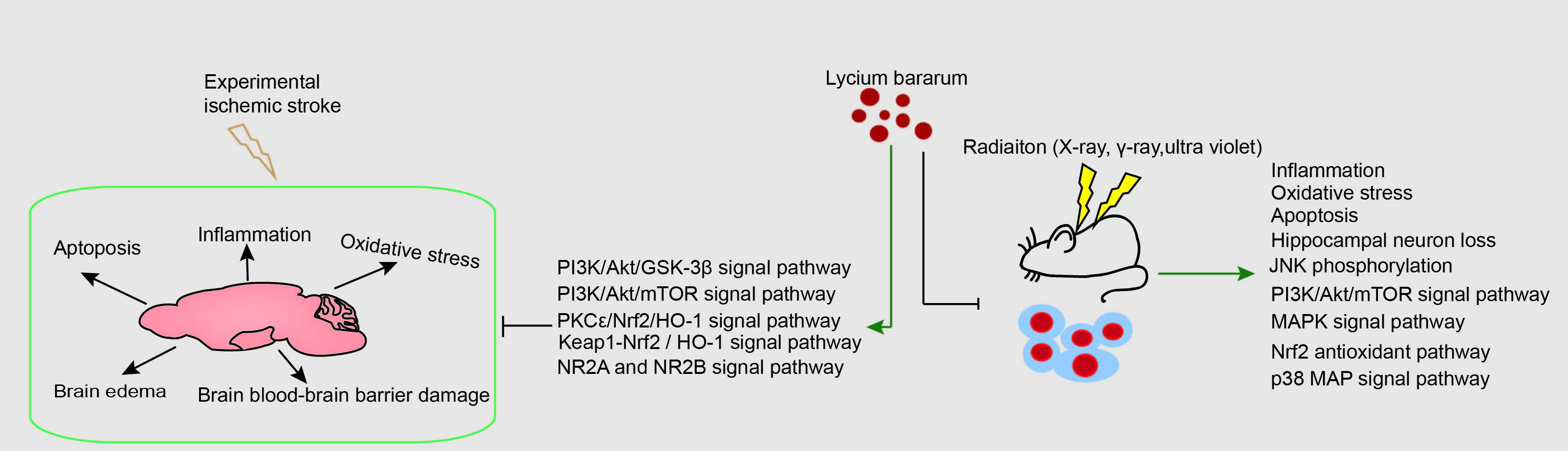 Although more and more attention has been paid to ischemic stroke, therapeutic treatments are limited to intravenous thrombolysis with recombinant tissue plasminogen activator [158, 159]. The combined complexity of the brain structure and the timeliness with which patients receive treatment compromise clinical treatment of ischemic stroke [11]. Similarly, the mechanism of radiation-induced brain damage is still unclear and there is no ideal radioprotective drug in clinical practice. Many experimental studies have strongly suggested that Lycium barbarum produces neuroprotective effects on neurological and neuropsychiatric diseases, ischemic stroke and injury induced by radiation exposure. These protective effects are mainly achieved by regulating brain oxidative stress, inflammation and neuronal apoptosis. By preventing neuronal loss, less neural pathway will be destroyed, and more newly generated neurons are integrated into the dentate gyrus-related afferent and efferent pathways which will reduce ischemic stroke- and radiation-induced impairment of learning and memory and patients’ symptoms.