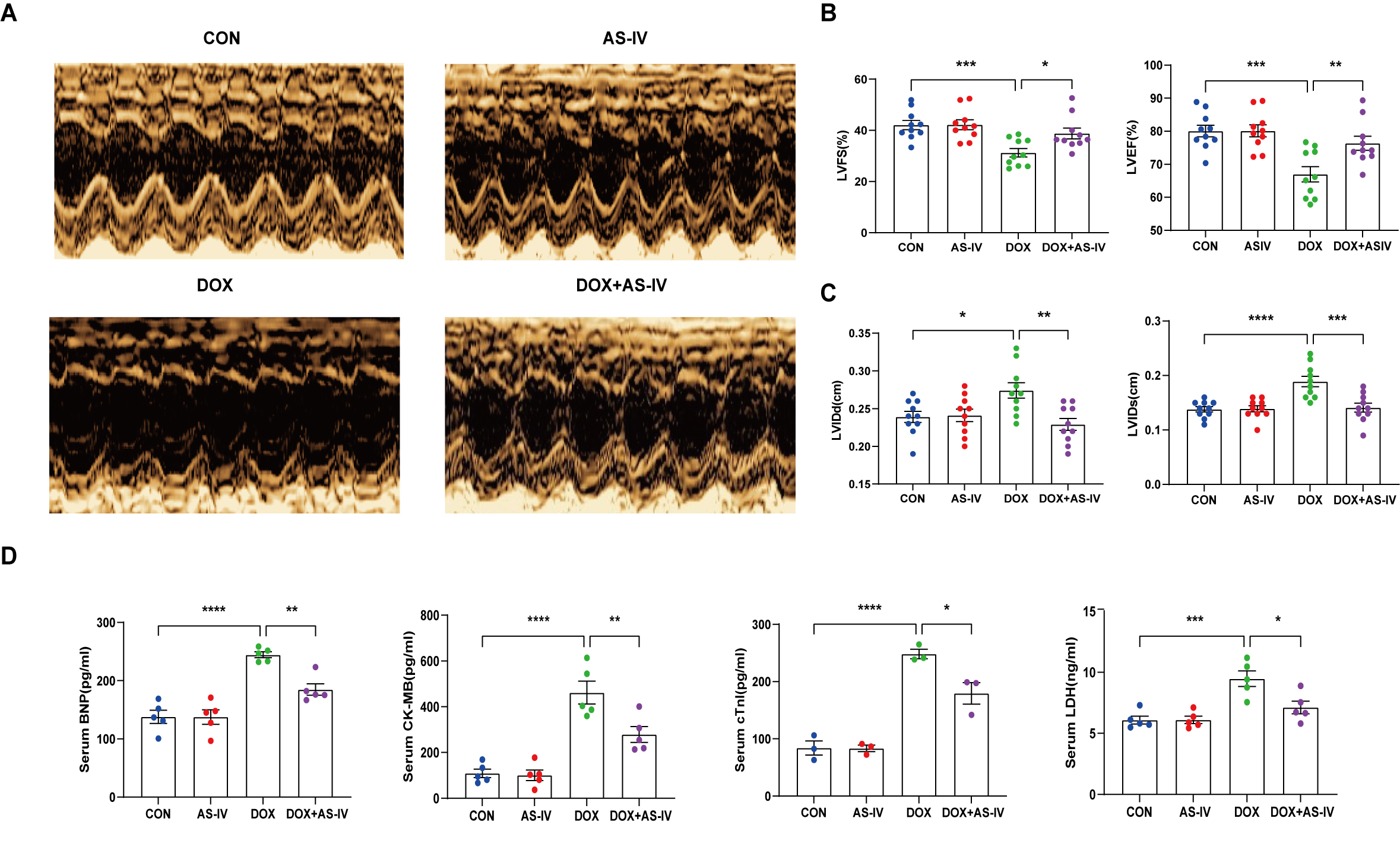 To investigate the cardioprotective effects of AS-IV, DOX-treated mice were subsequently treated with AS-IV. After 4 weeks of intervention, transthoracic echocardiography was performed to evaluate cardiac structure and function in the four groups of mice (Fig. 1A). Our data indicated that intraperitoneal injection of DOX caused cardiac dysfunction, as evidenced by reduced LVEF and LVFS, compared with that in the control group. However, LVEF and LVFS significantly improved in mice treated with AS-IV (Fig. 1B). In terms of heart structure, LVIDd and LVIDs were increased in the DOX group compared to the control group, and LVIDd and LVIDs were lower in the AS-IV-treated mice than in the DOX-treated mice (Fig. 1C). To further evaluate the effects of DOX and AS-IV on cardiac function, we measured serum BNP, CK-MB, cTnI, and LDH levels, which are classical biomarkers of cardiac injury. As shown in Fig. 1D, the serum levels of BNP, CK-MB, cTnI, and LDH of the mice in the DOX group were significantly higher than those in the control group. Compared with the model group, the serum concentrations of these heart injury markers were reduced in the AS-IV-treated group. The results indicate that AS-IV alone does not alter cardiac function but can improve DOX-induced cardiac dysfunction.