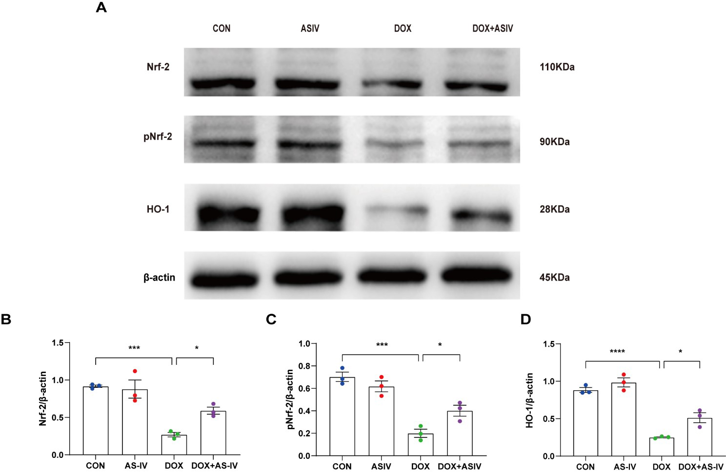 The Nrf-2 signaling pathway has been found to have a potential protective effect on neuronal, vascular endothelial, and cardiac myocyte injury caused by pyroptosis [35, 36, 37]. To further explore the possible regulatory pathways of pyroptosis, we examined the expression of Nrf-2, pNrf-2 and HO-1 (Fig. 6A). Western blotting results in Fig. 6 reveal a reduced expression of Nrf-2, pNrf-2, and HO-1 in the DOX-treated group. AS-IV activates Nrf-2 to phosphorylate it and increases the expression of HO-1. The remaining two western blots images can be found in the supplemental file.