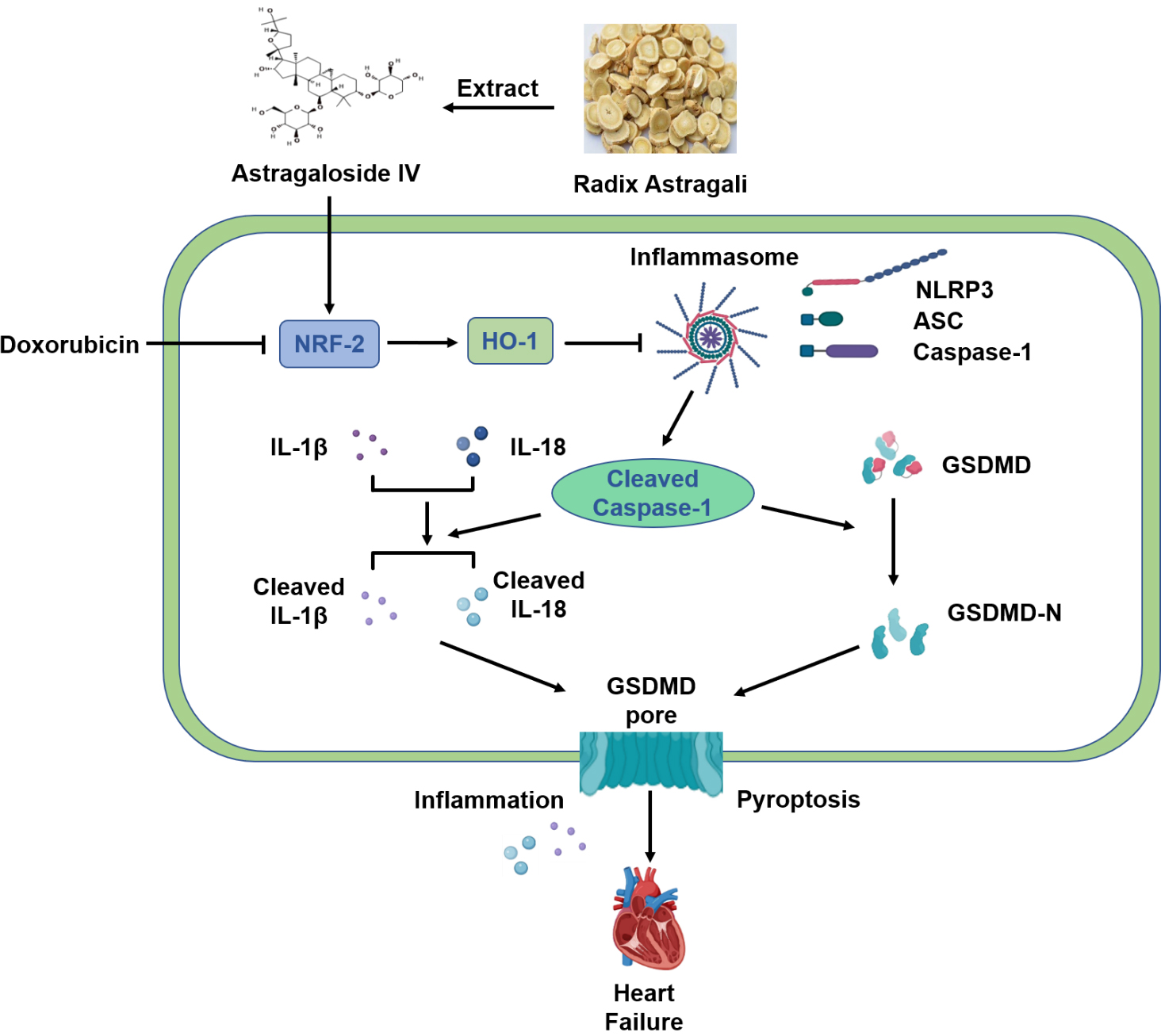In conclusion, our results suggest that AS-IV exerts a protective effect against DOX-induced myocardial injury by activating the Nrf-2/HO-1 signaling pathway and by inhibiting NLRP3-mediated pyroptosis (Fig. 7). These results provide evidence for AS-IV to be employed as a potential clinical therapeutic agent for mitigating DOX-induced cardiotoxicity. However, further research using positive controls or gene knockout mice will provide better evidences for verifying the specific mechanisms of the Nrf-2/HO-1 pathway in the protective role of AS-IV in suppressing DOX-induced pyroptosis.