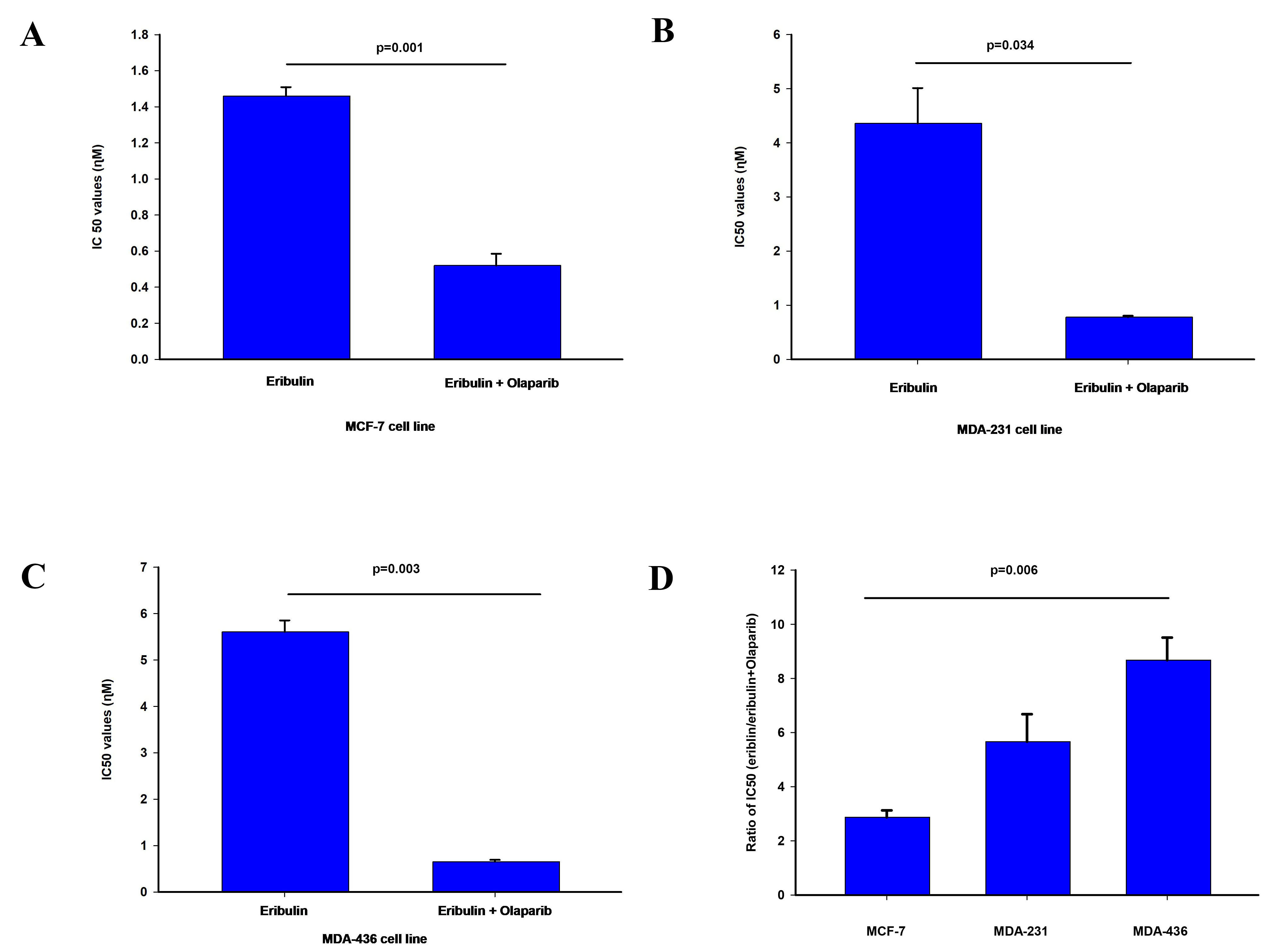 MDA-231 and MDA-436 are triple negative breast cancer cell lines and MCF-7 is an ER+/HER2- breast cancer cell line. They were obtained from the American Type Culture Collection (ATCC) and maintained following the manufacturer instructions. The cell lines used have been tested and are negative for mycoplasma. Eribulin mesylate 0.5 mg/mL was obtained from Eisai LTD (Mississauga, ON, Canada) and olaparib was provided by Selleckchem Company (Houston, Texas, USA).