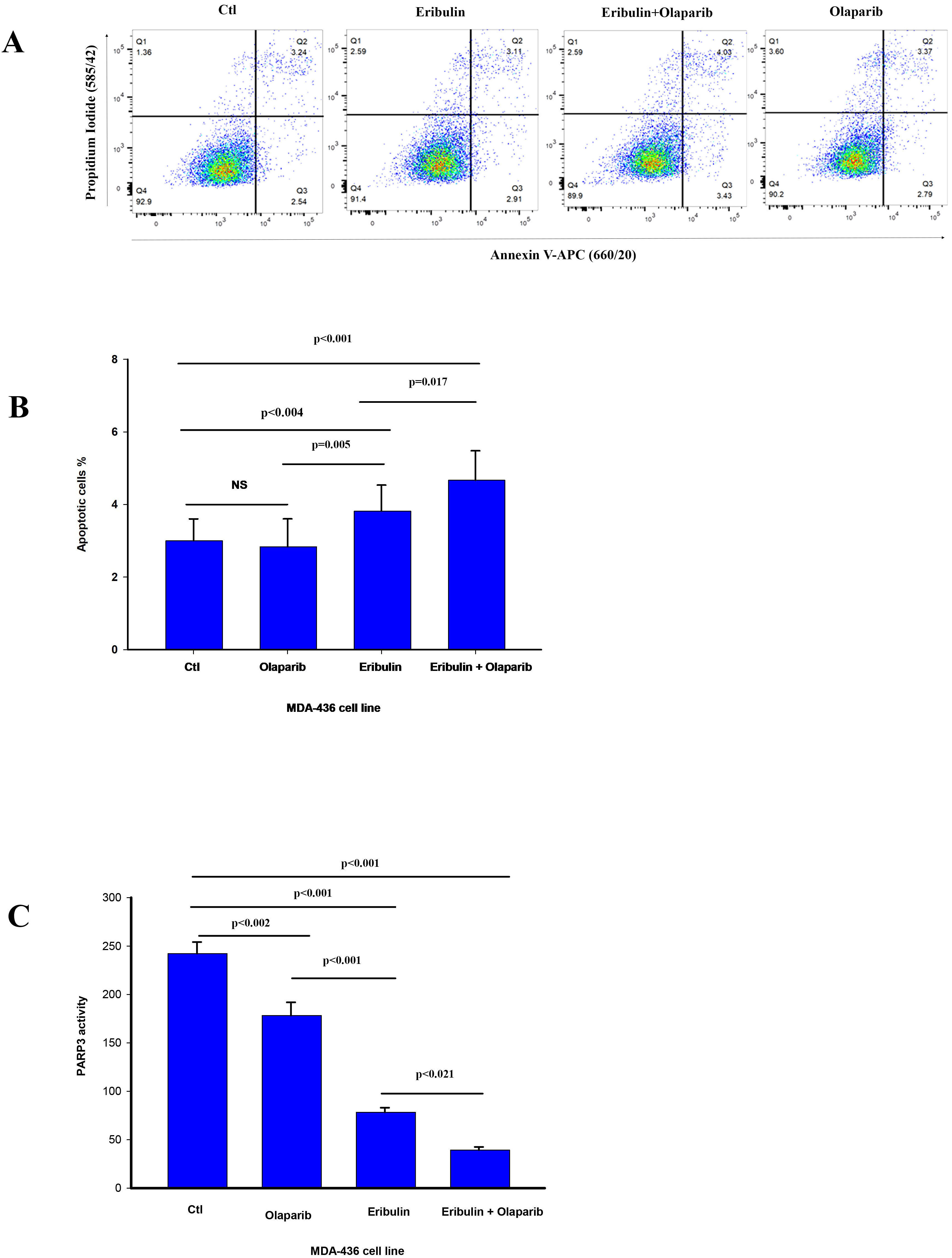Fig. 3.Olaparib enhances eribulin induced apoptosis and reduces PARP3